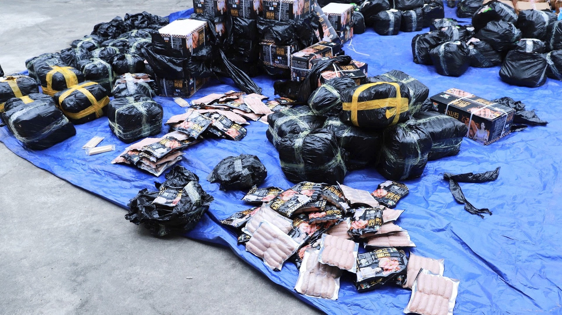 Tiến hành kiểm tra chi tiết hai phương tiện, tổ công tác phát hiện tại khu vực hàng ghế phía sau và thùng xe chứa nhiều túi ni lông đen. Bên trong các túi này là nhiều gói thực phẩm, chủ yếu là xúc xích, trên bao bì có in chữ nước ngoài (Trung Quốc). Tổng trọng lượng của số hàng hóa này được xác định là 2.340kg.