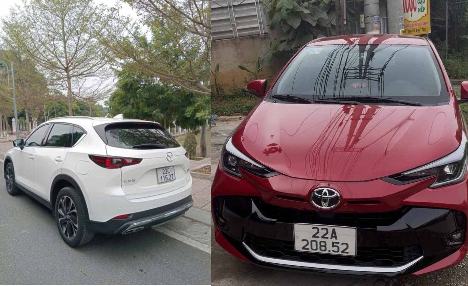 (1) Xe ô tô con nhãn hiệu Mazda, số loại CX5, màu sơn Trắng, biển số 22C-116.27. (2) Xe ô tô con nhãn hiệu Toyota, số loại Vios E CVT, màu sơn Đỏ, biển số 22A-208.52, đây là 2 phương tiện đang bị truy tìm.