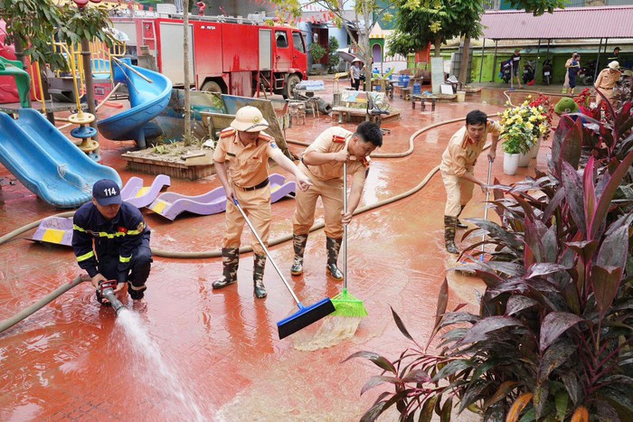 Ngay khi lũ rút, lực lượng Cảnh sát Phòng cháy chữa cháy và cứu nạn cứu hộ không quản ngày đêm tích cực hỗ trợ, tiếp nước sinh hoạt cho người dân và tổ chức tổng vệ sinh môi trường với phương châm "nước rút tới đâu, dọn dẹp tới đó".