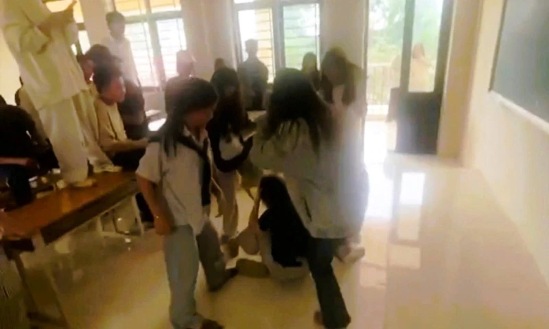 Trong clip ghi lại cảnh nữ sinh N. bị đánh, có rất đông bạn học (cả nam và nữ) chứng kiến nhưng không ai can ngăn, một số bạn còn thản nhiên ấy điện thoại ra quay clip.