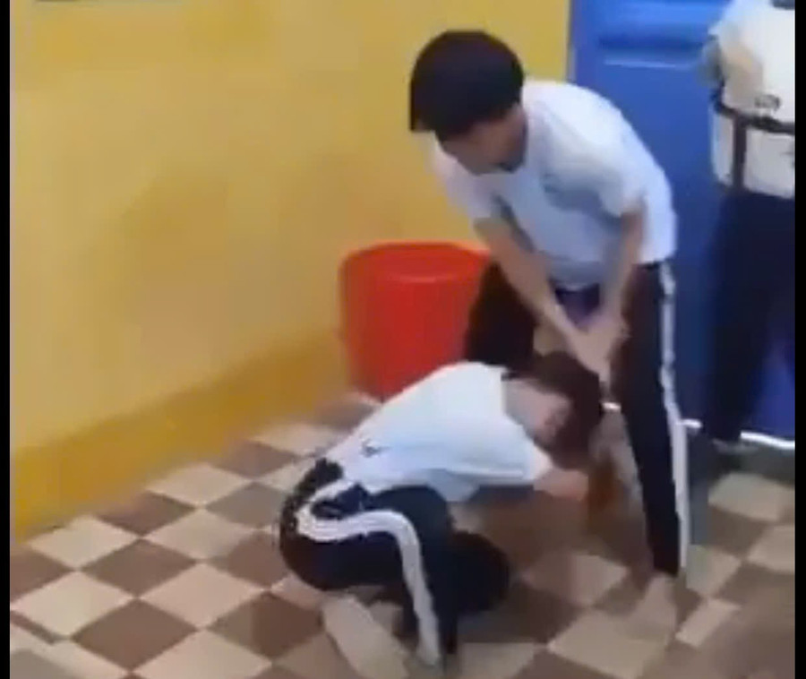 Hình ảnh nhóm học sinh xô xát trong lớp học tại An Giang. Ảnh cắt từ clip lan truyền trên mạng.