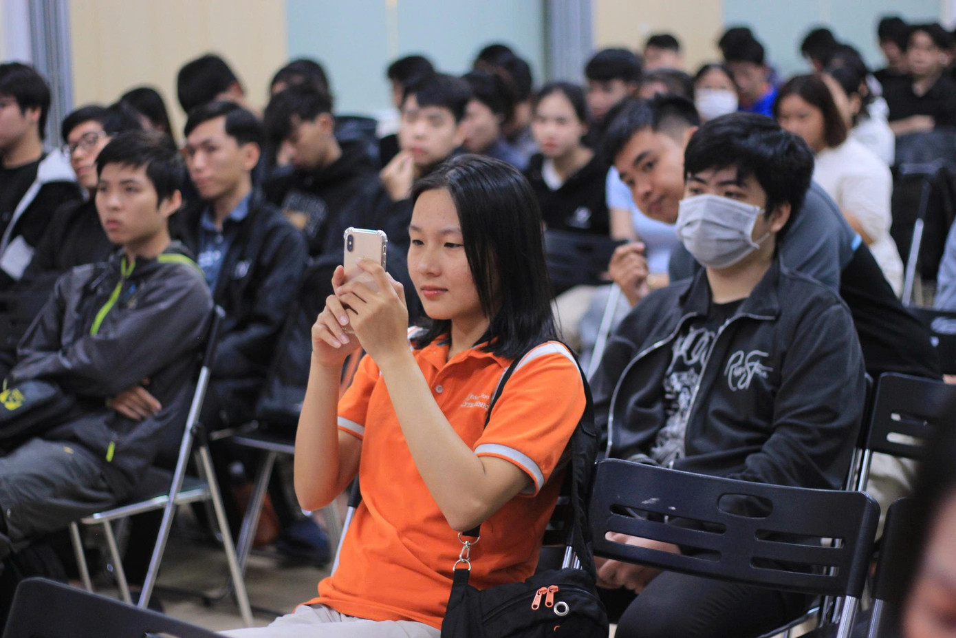 Sinh viên thích thú ghi lại các chia sẻ của công an về thủ đoạn lừa đảo.