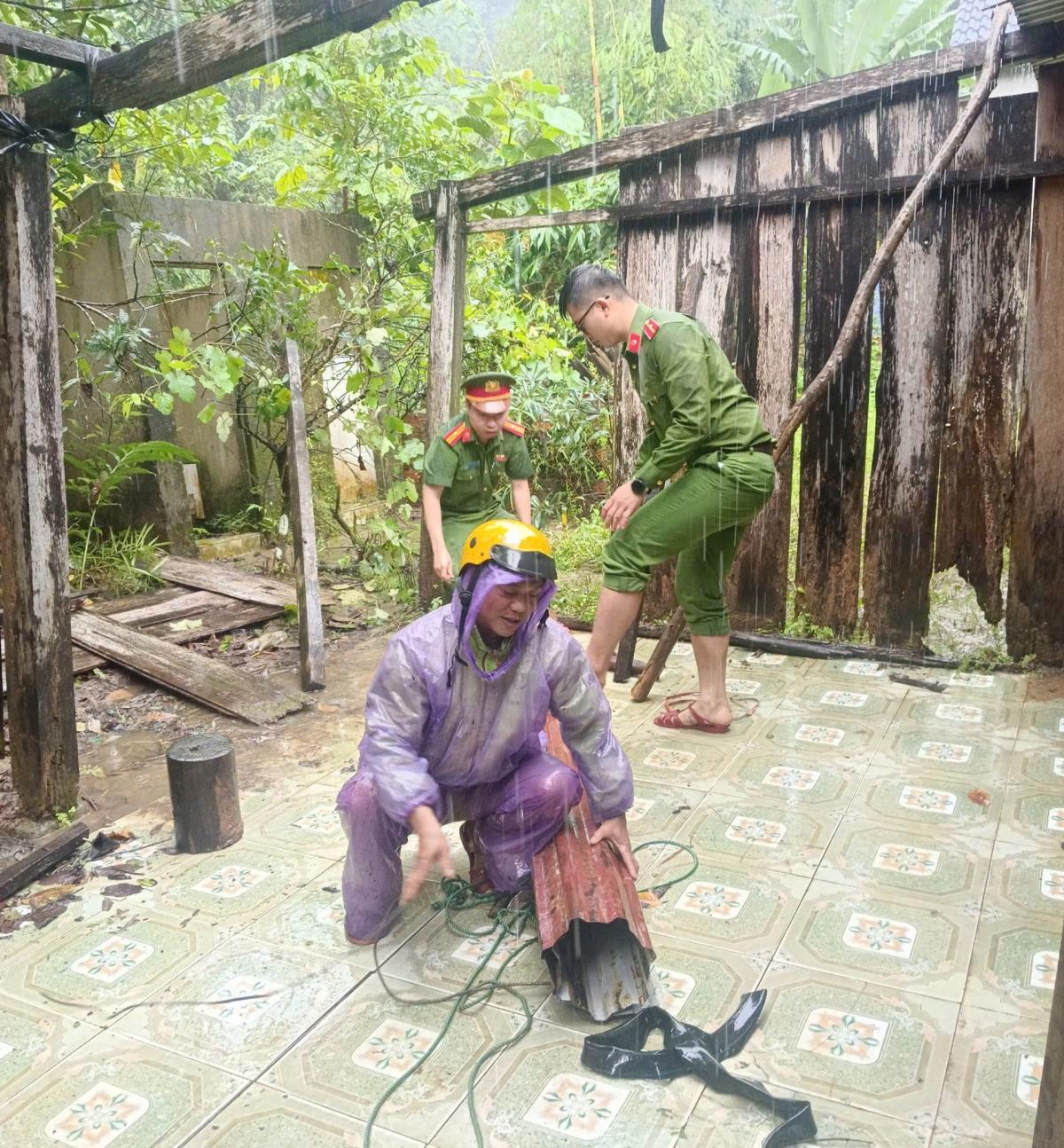 Công an xã A Vương giúp nhân dân sửa chữa lại nhà cửa, dọn dẹp tài sản sau mưa lũ
