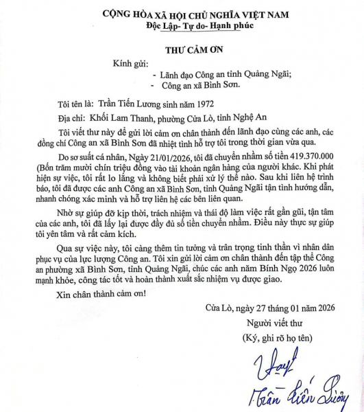 Ngày 27/1, Công an xã Bình Sơn đã nhận được thư cảm ơn của ông Trần Tiến Lương, bày tỏ sự trân trọng trước tinh thần trách nhiệm của lực lượng Công an và nghĩa cử trung thực, nhân văn của anh Hồ Văn Nghị.