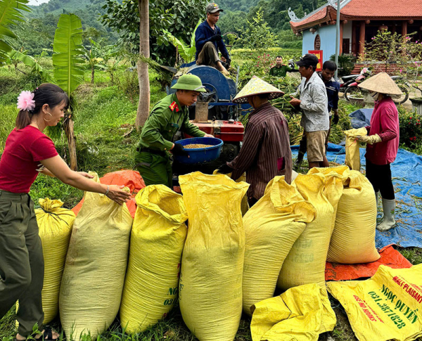 Lực lượng Công an xã đã trực tiếp hỗ trợ các hộ dân thu hoạch, vận chuyển và cất trữ lúa an toàn trước khi mưa bão ảnh hưởng đến địa bàn.