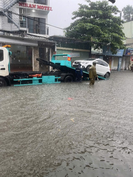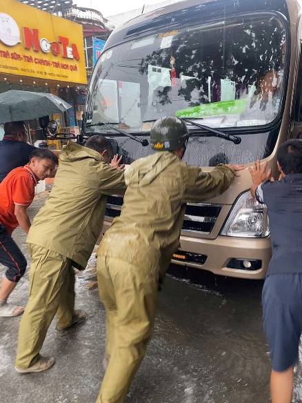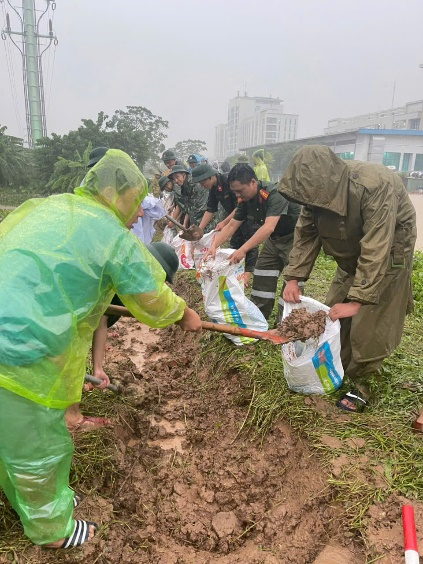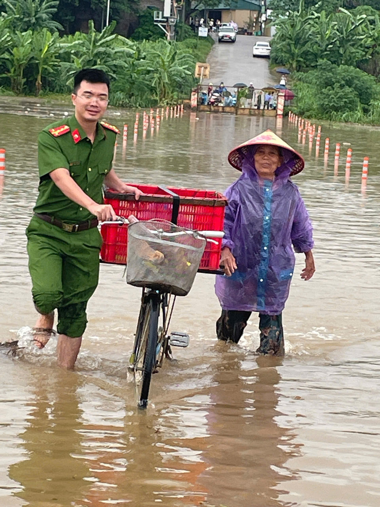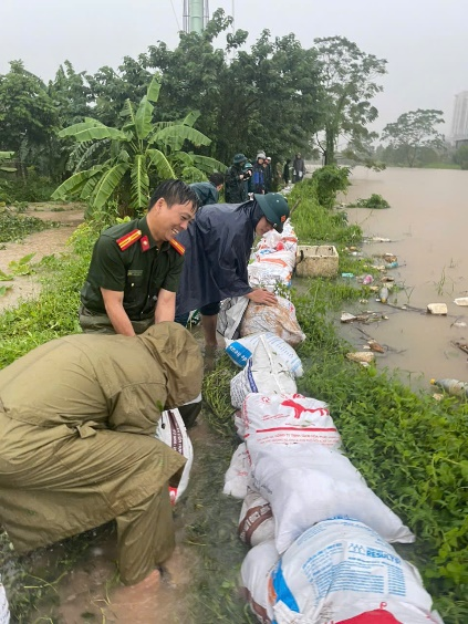 Cùng ngày, tại phường Xuân Phương (quận Nam Từ Liêm), mưa bão gây ngập úng diện rộng trên nhiều tuyến đường huyết mạch. Công an phường đã khẩn trương phối hợp phân luồng, hỗ trợ phương tiện mắc kẹt, sơ tán người dân ra khỏi khu vực ngập, đồng thời tham gia gia cố đê sông Nhuệ – Miêu Nha, ngăn nước tràn vào khu dân cư.