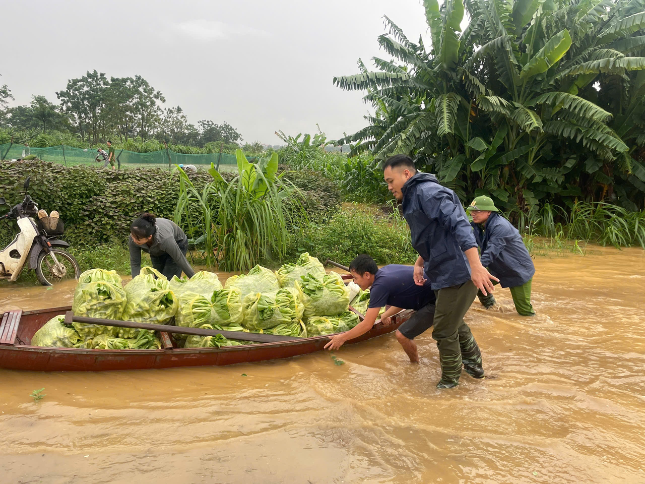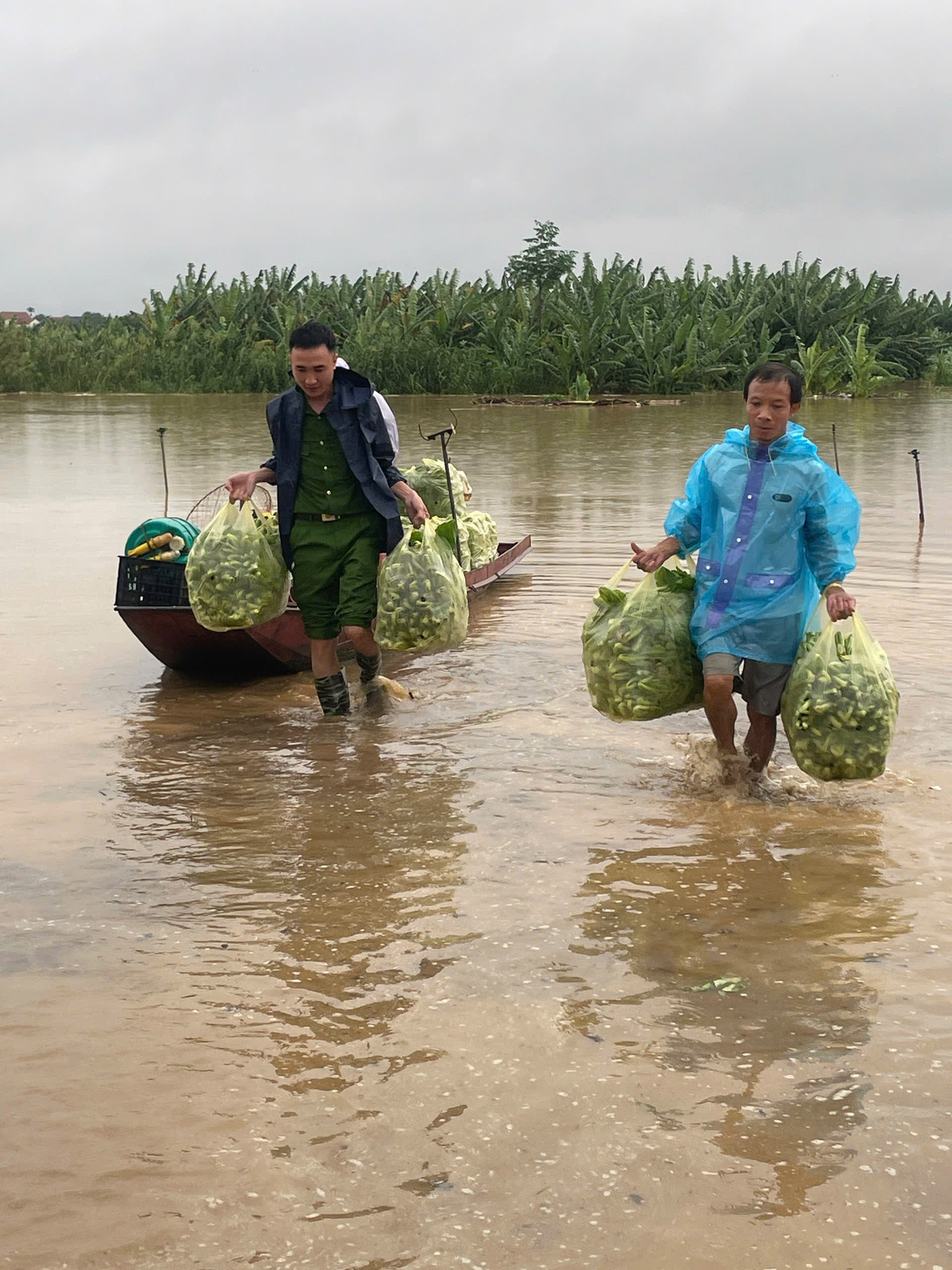Công an xã Minh Châu hỗ trợ người dân vận chuyển nhu yếu phẩm, thu hoạch hoa màu để giảm thiểu thiệt hại do mưa lũ.