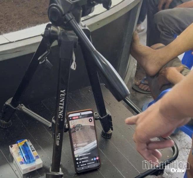 Các đối tượng sử dụng điện thoại, tripod dùng để livestream tại tụ điểm đá gà cá cược ở quán cà phê Sang Mỹ Gà Chọi.