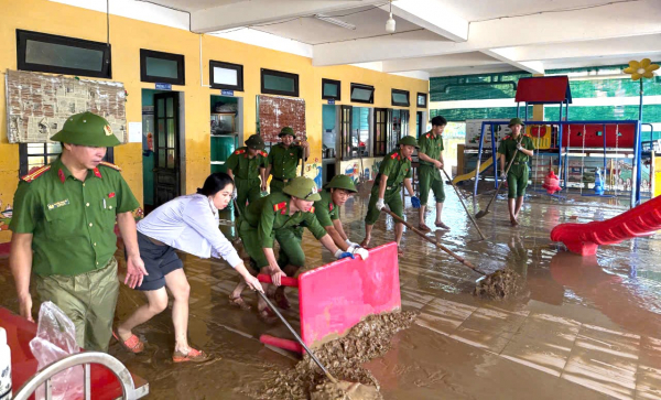 Tại địa bàn phường Mỹ Thượng, TP Huế, sáng sớm nay, khi nước lũ vừa rút, Công an phường Mỹ Thượng đã bố trí nhiều tổ CBCS đến các Trường mầm non, Trường Tiểu học Phú Mỹ, Phú An, Phú Thượng để hỗ trợ vệ sinh môi trường sau lũ. Các CBCS Công an cùng thầy, cô giáo nhà trường tiến hành thu dọn bùn đất, nhặt rác, lau chùi, xịt rửa bàn ghế, phòng học, sân trường… để giúp các trường sớm đón học sinh đi học trở lại.