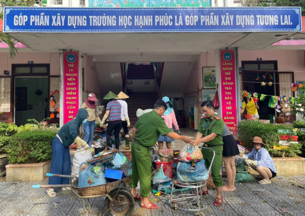 Cán bộ Công an phường Thuận Hóa tham gia dọn rác tại trường học sau lũ.