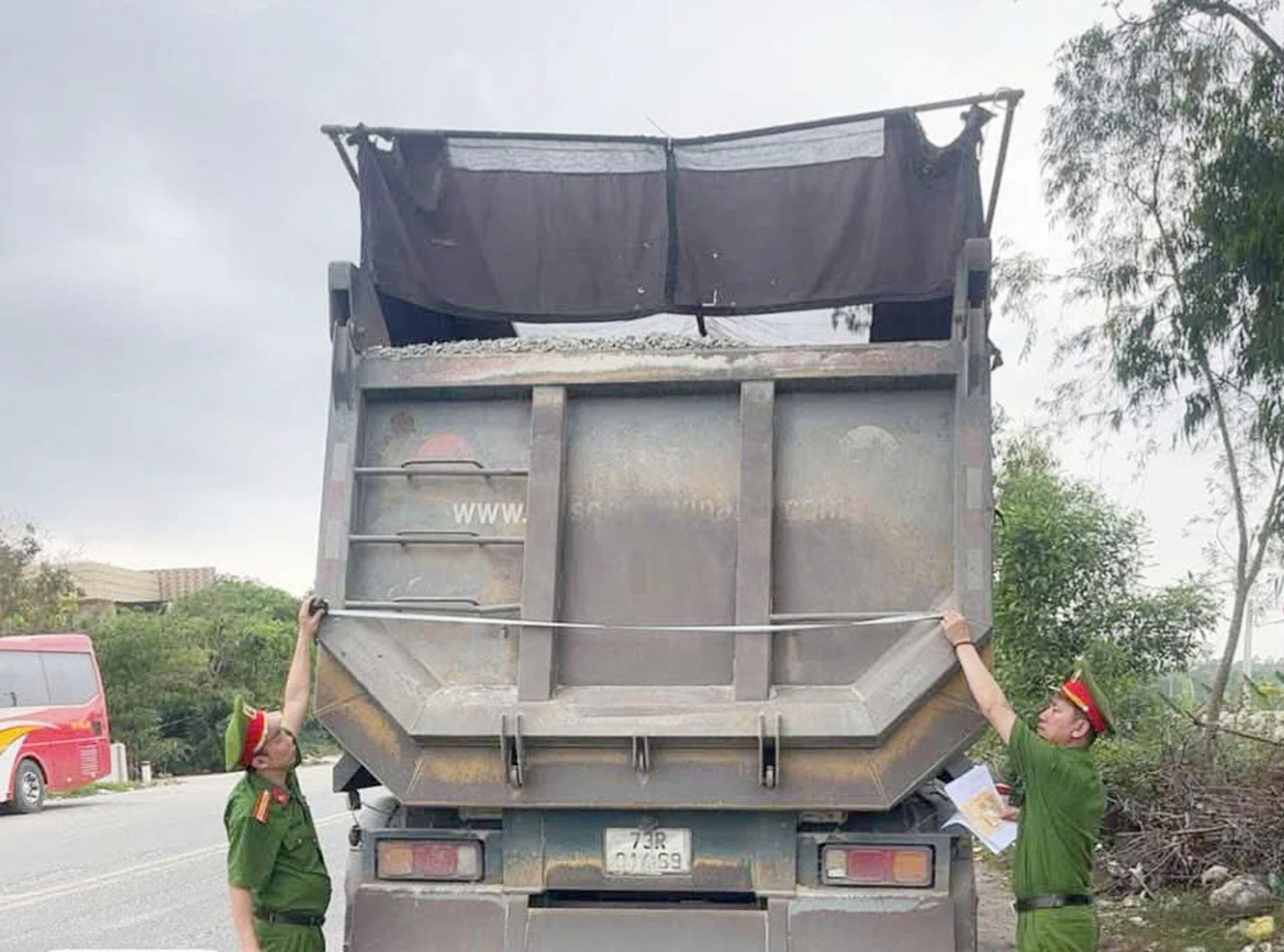 Công an xã Quảng Trạch kiểm tra kích thước thành thùng xe tải - Ảnh: B.T