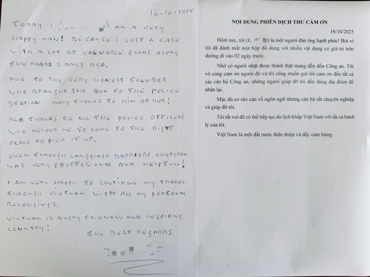 Ngay sau đó, nam du khách đã viết thư cảm ơn người nhặt được tài sản và lực lượng Công an xã.