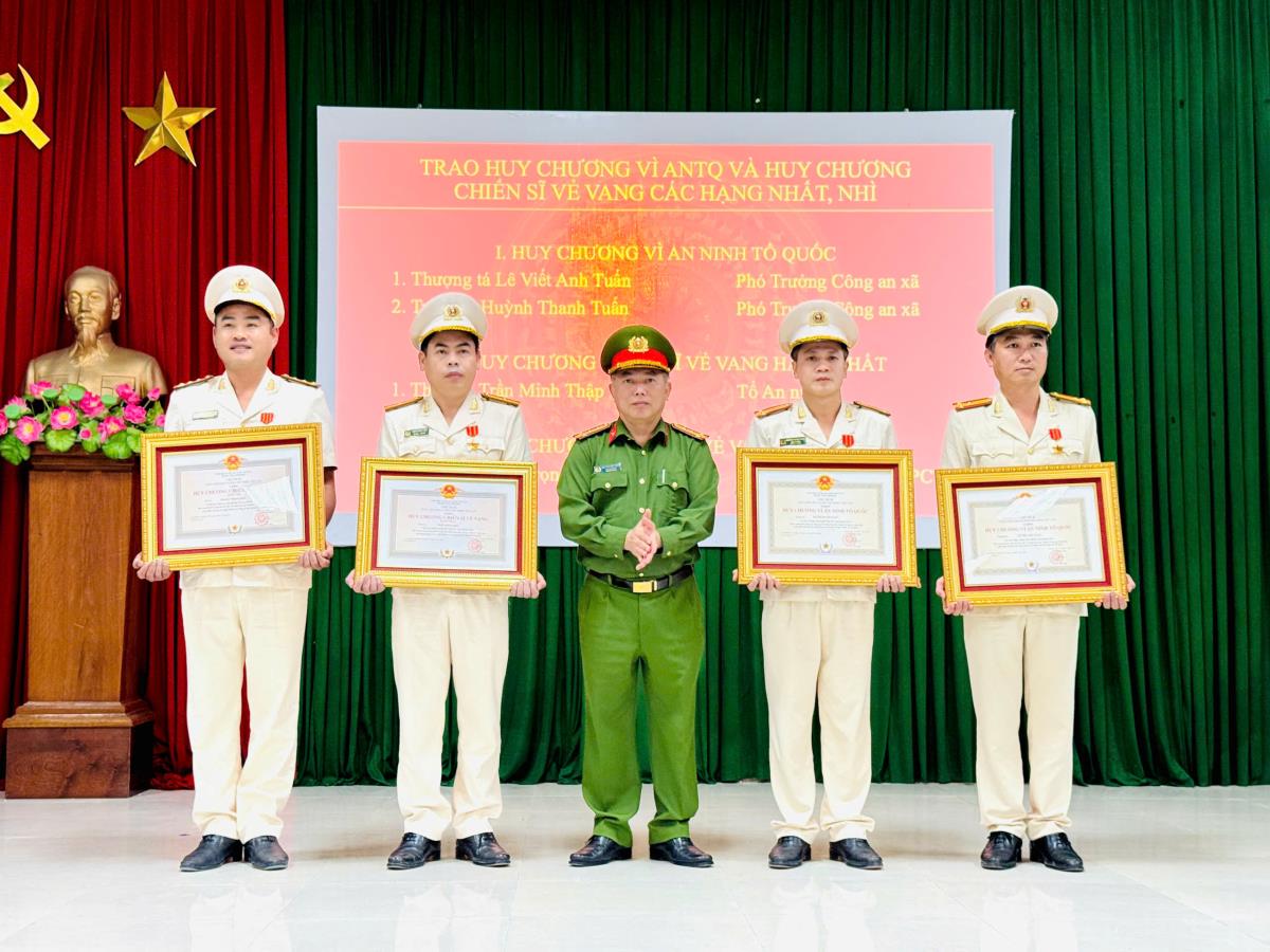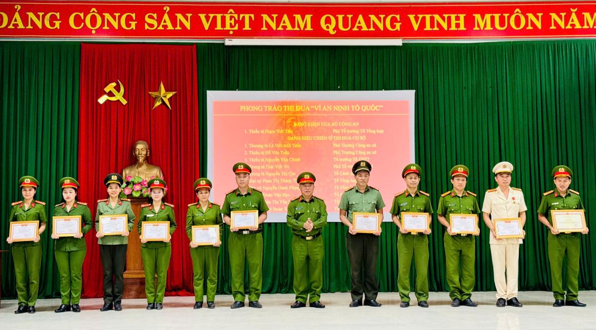 Đại tá Nguyễn Văn Tăng trao Bằng khen của Bộ Công an và Danh hiệu “Chiến sĩ thi đua cơ sở” cho các cá nhân.Ảnh: ÁI Ly