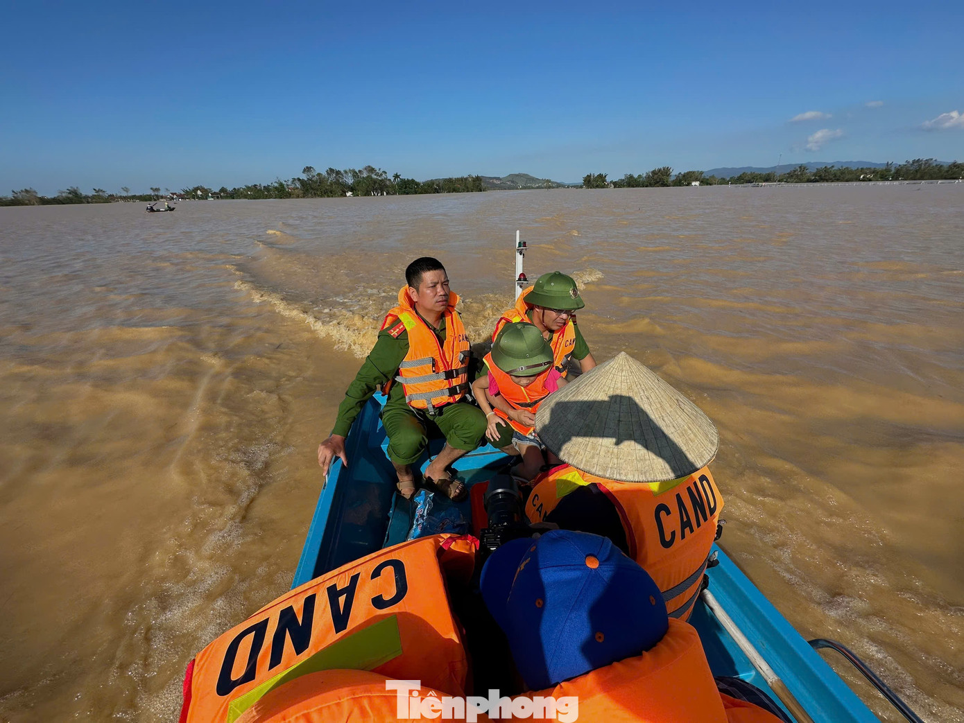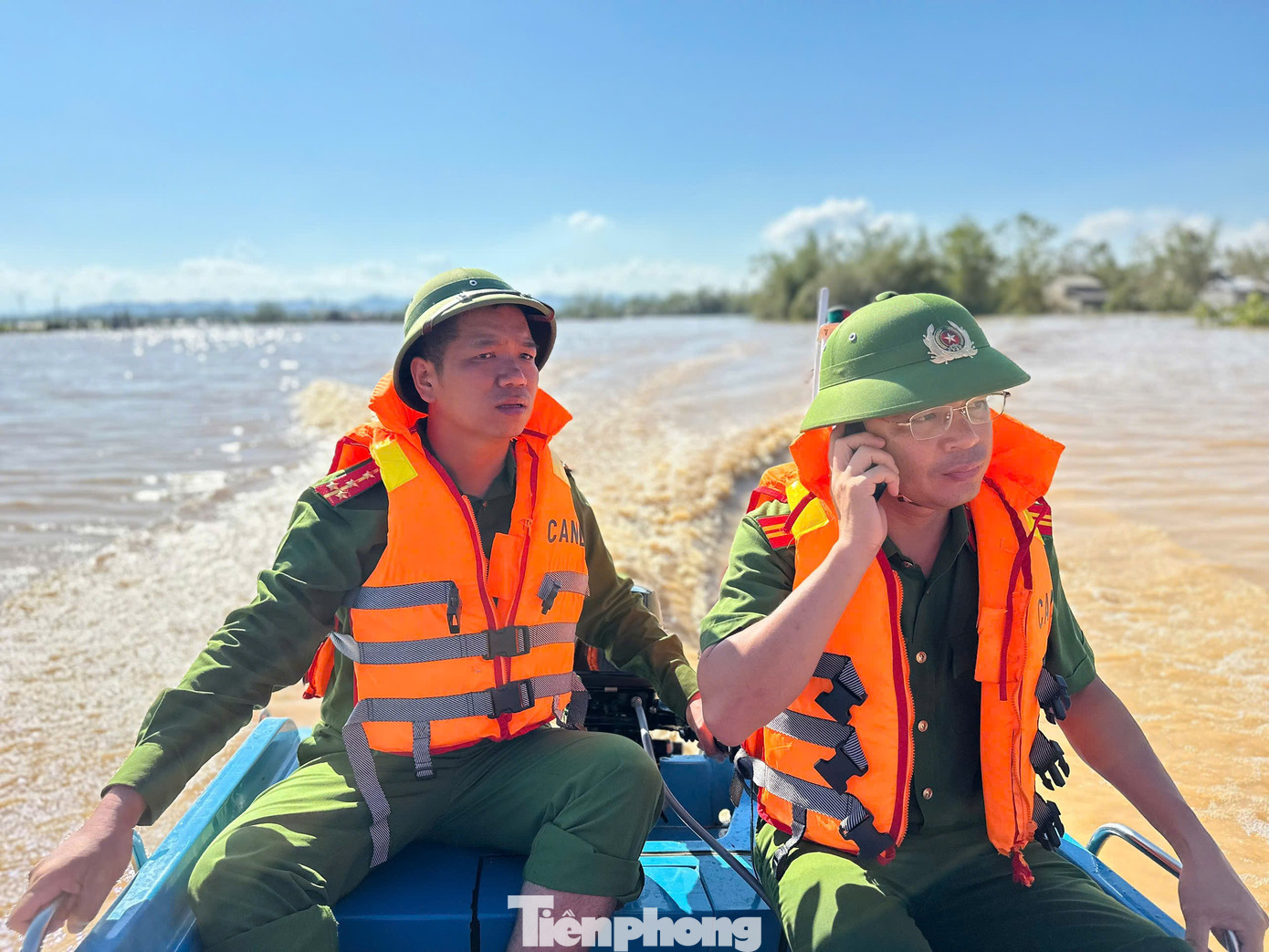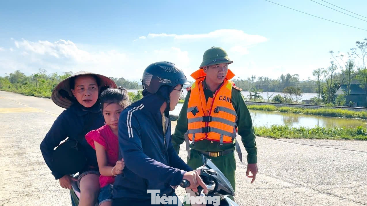 Khi đưa cháu bé ra đến khu vực đường lớn không còn bị ngập, do không có phương tiện phù hợp để tiếp tục di chuyển, lực lượng công an đã kịp nhờ một người dân địa phương hỗ trợ xe máy. Trong ảnh chiến sĩ công an hỗ trợ, hướng dẫn để đảm bảo cháu bé được đưa đi cấp cứu an toàn và kịp thời.