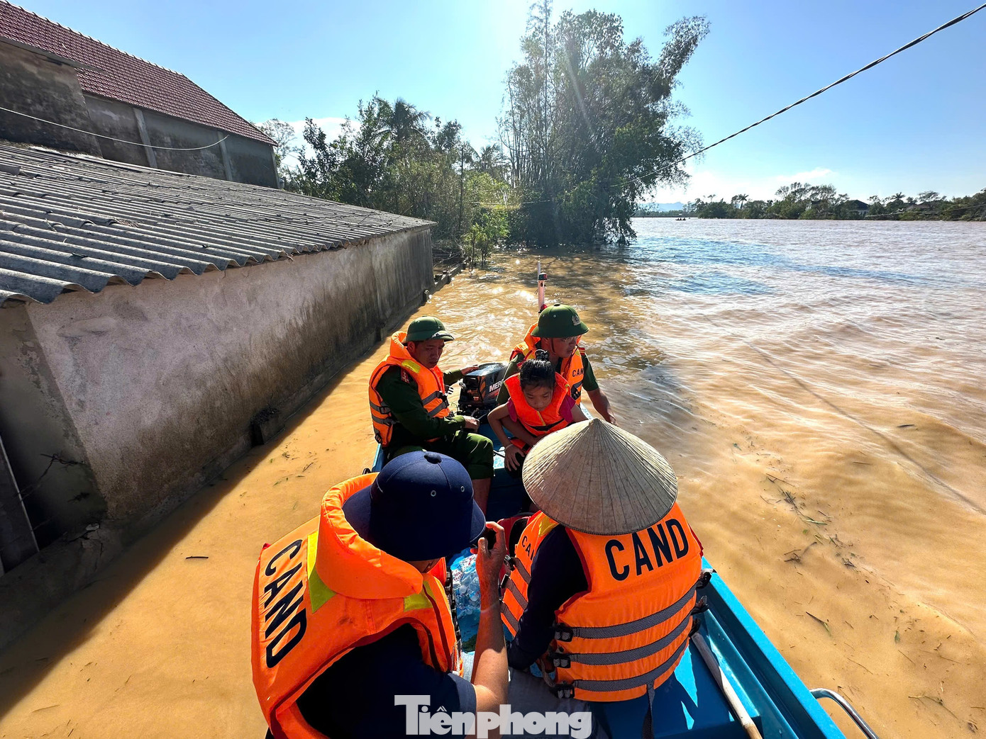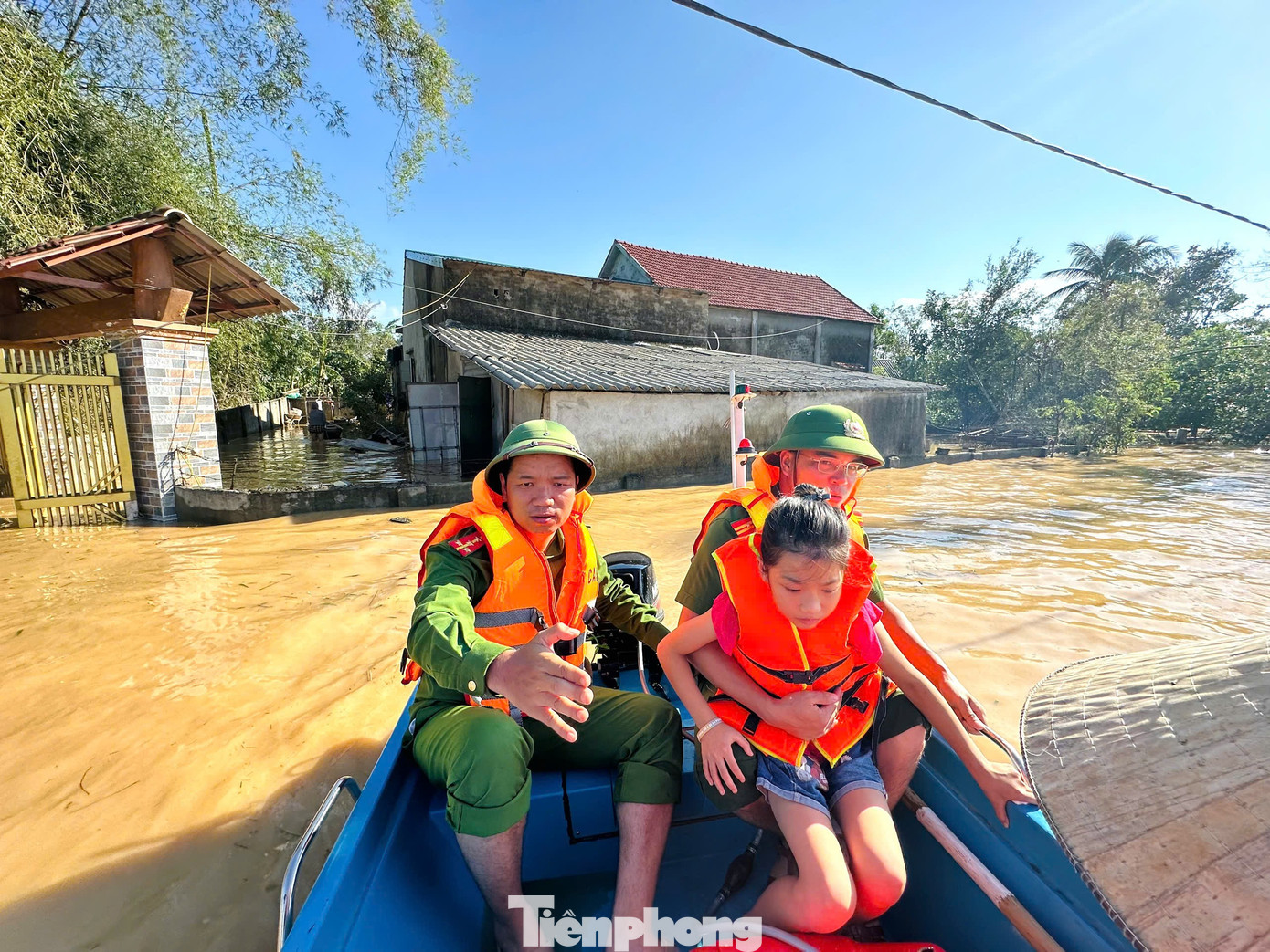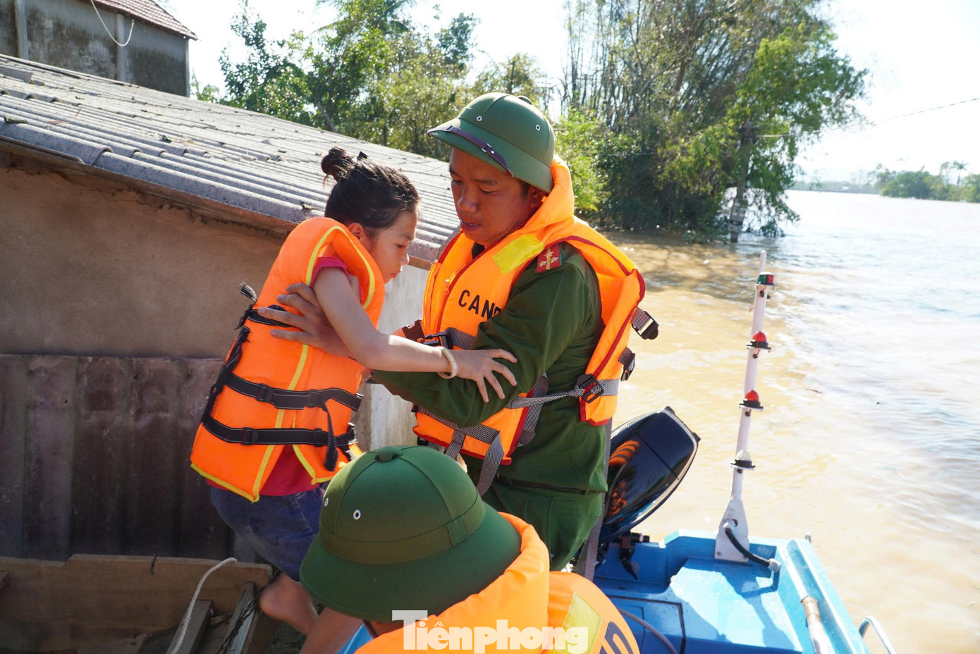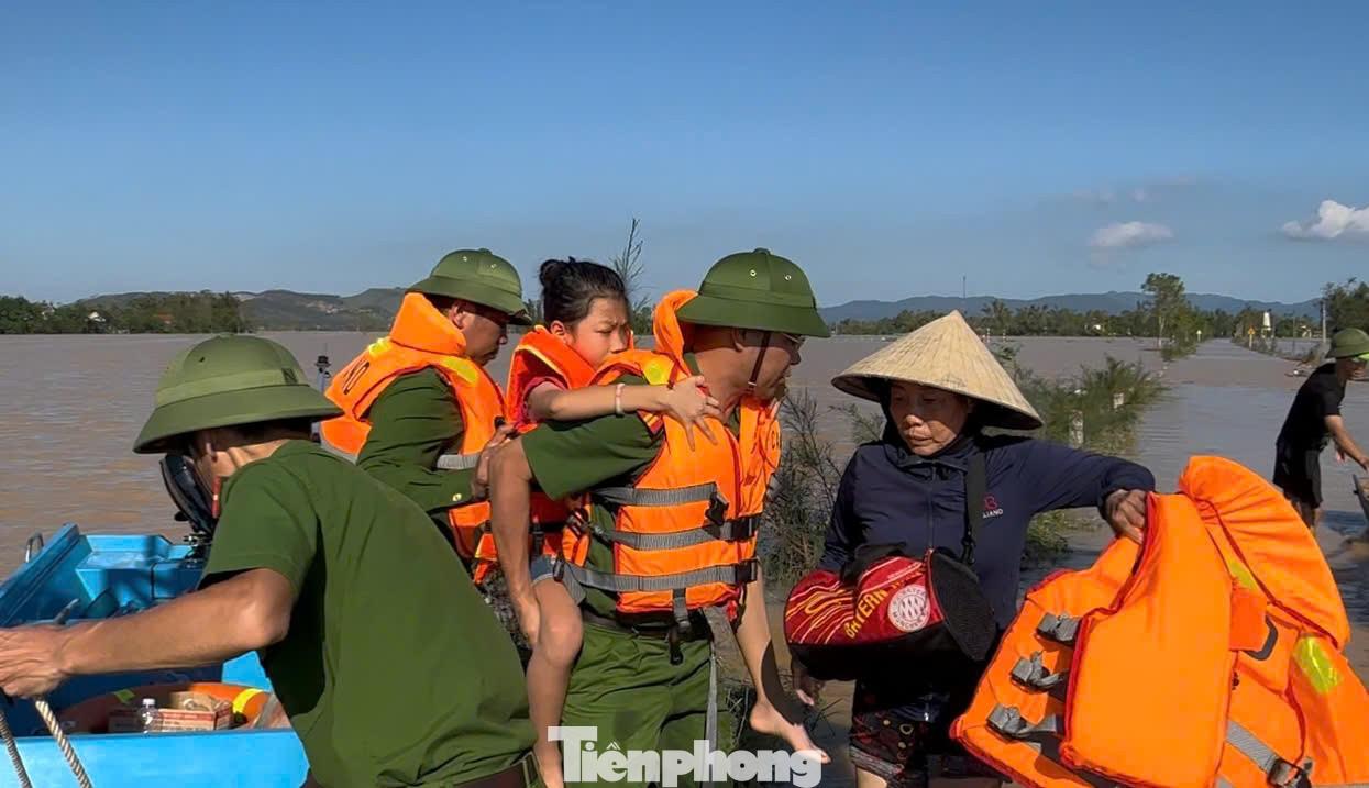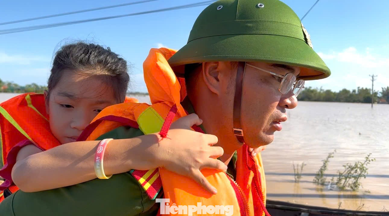 Chiều 2/10, khi đang thực hiện nhiệm vụ tiếp tế nước, lương thực cho người dân, Công an xã Đức Minh (Hà Tĩnh) nhận được cuộc gọi khẩn cấp từ gia đình bà Võ Thị Thuận (59 tuổi) ở thôn Diên Phúc, xin hỗ trợ đưa cháu gái là Nguyễn Thảo Nguyên (11 tuổi) đi cấp cứu trong khi gia đình đang bị cô lập trong lũ.