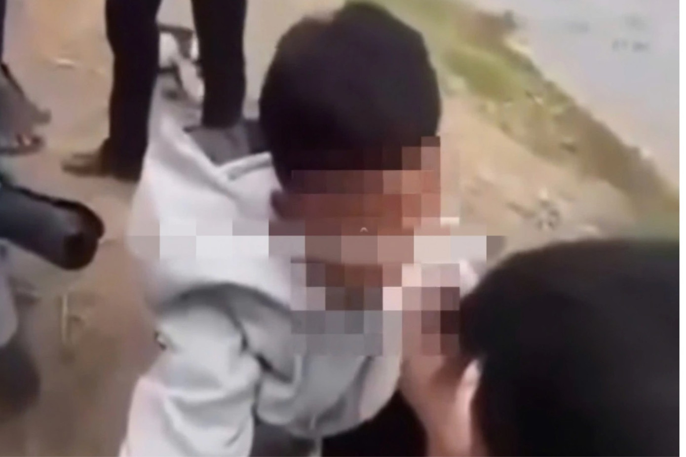 Hình ảnh nam sinh H. ở An Giang bị nhóm bạn hành hung và nhét băng vệ sinh vào miệng. Ảnh cắt từ clip.