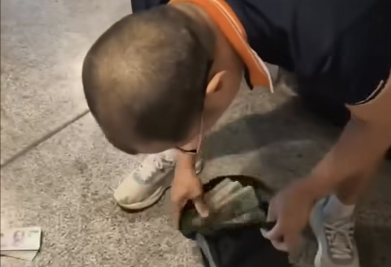Người đàn ông nhặt các cọc tiền mệnh giá 500.000 dưới đất cho vào túi. (Ảnh cắt từ ciip)