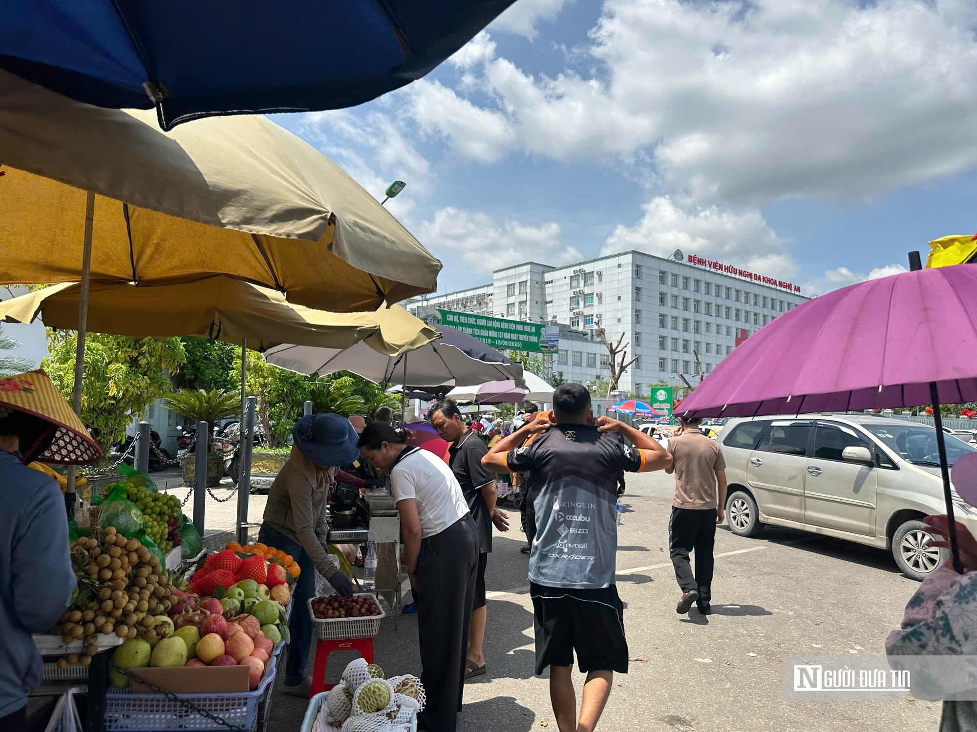 Có mặt tại cổng Bệnh viện Hữu nghị Đa khoa Nghệ An (phường Vinh Phú, tỉnh Nghệ An), phóng viên ghi nhận nhiều hàng quán, gánh hàng rong chen chúc, ngang nhiên bày bán đủ loại đồ ăn, nước uống, hoa quả, đồ dùng thiết yếu.