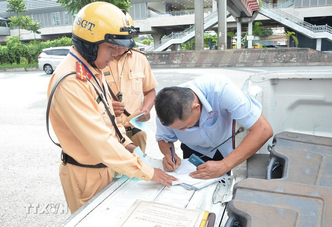 Cảnh sát giao thông lập biên bản một trường hợp tài xế xe khách vi phạm. (Ảnh: Linh Sơn/TTXVN)