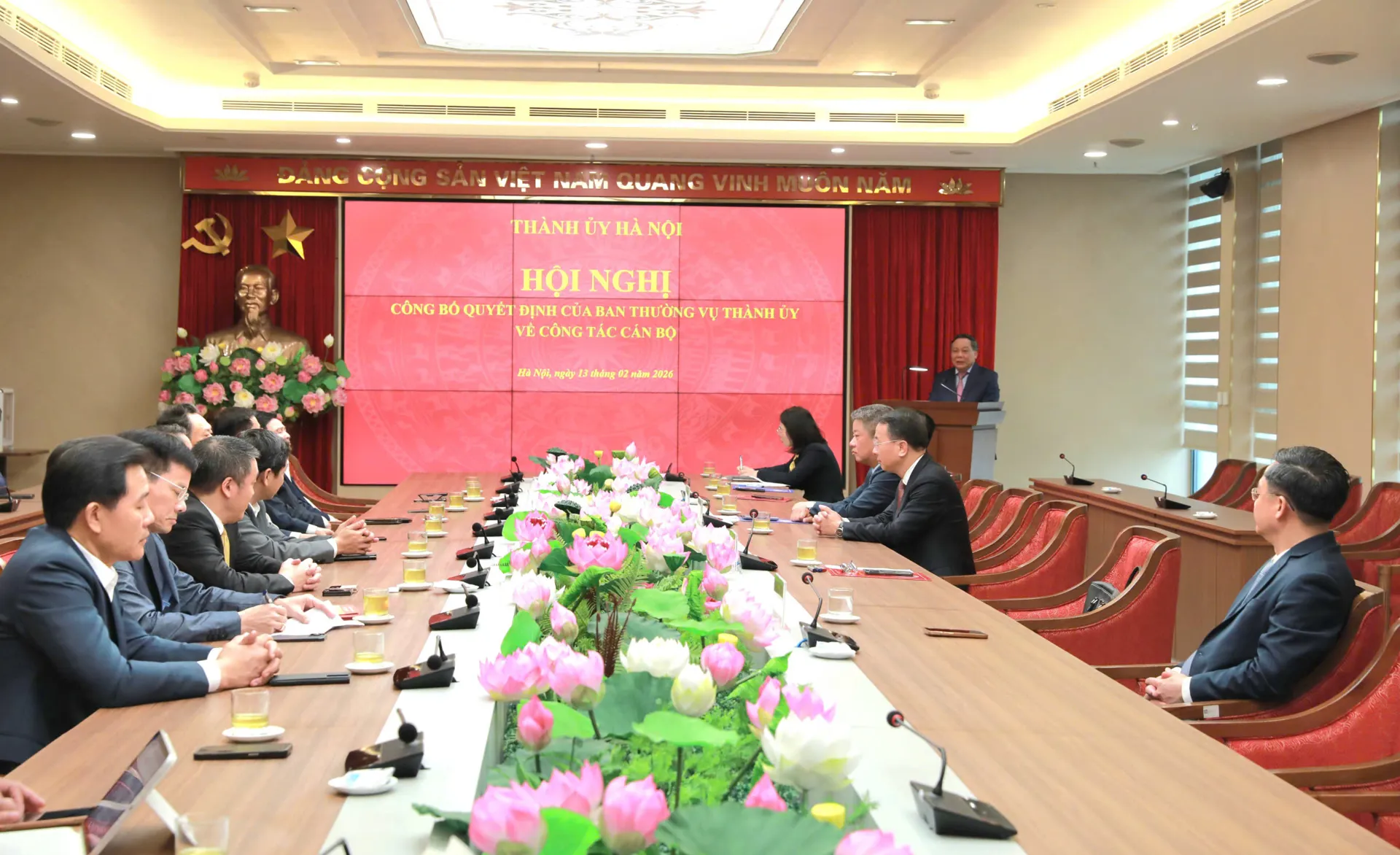 Tại hội nghị, Phó Trưởng ban Tổ chức Thành ủy Lê Trung Kiên đã công bố 2 quyết định của Ban Thường vụ Thành ủy Hà Nội về công tác cán bộ. Cụ thể, theo Quyết định số 1179-QĐ/TU, ngày 11/2/2026, Ban Thường vụ Thành ủy Hà Nội quyết định, ông Bùi Duy Cường (sinh năm 1973) - Thành ủy viên, Bí thư Đảng ủy, Chủ tịch HĐND xã Sóc Sơn thôi tham gia Ban Chấp hành, Ban Thường vụ và thôi giữ chức Bí thư Đảng ủy xã Sóc Sơn, nhiệm kỳ 2025-2030. Điều động, phân công đến công tác tại Sở Nông nghiệp và Môi trường TP để bổ nhiệm giữ chức Giám đốc Sở Nông nghiệp và Môi trường TP.