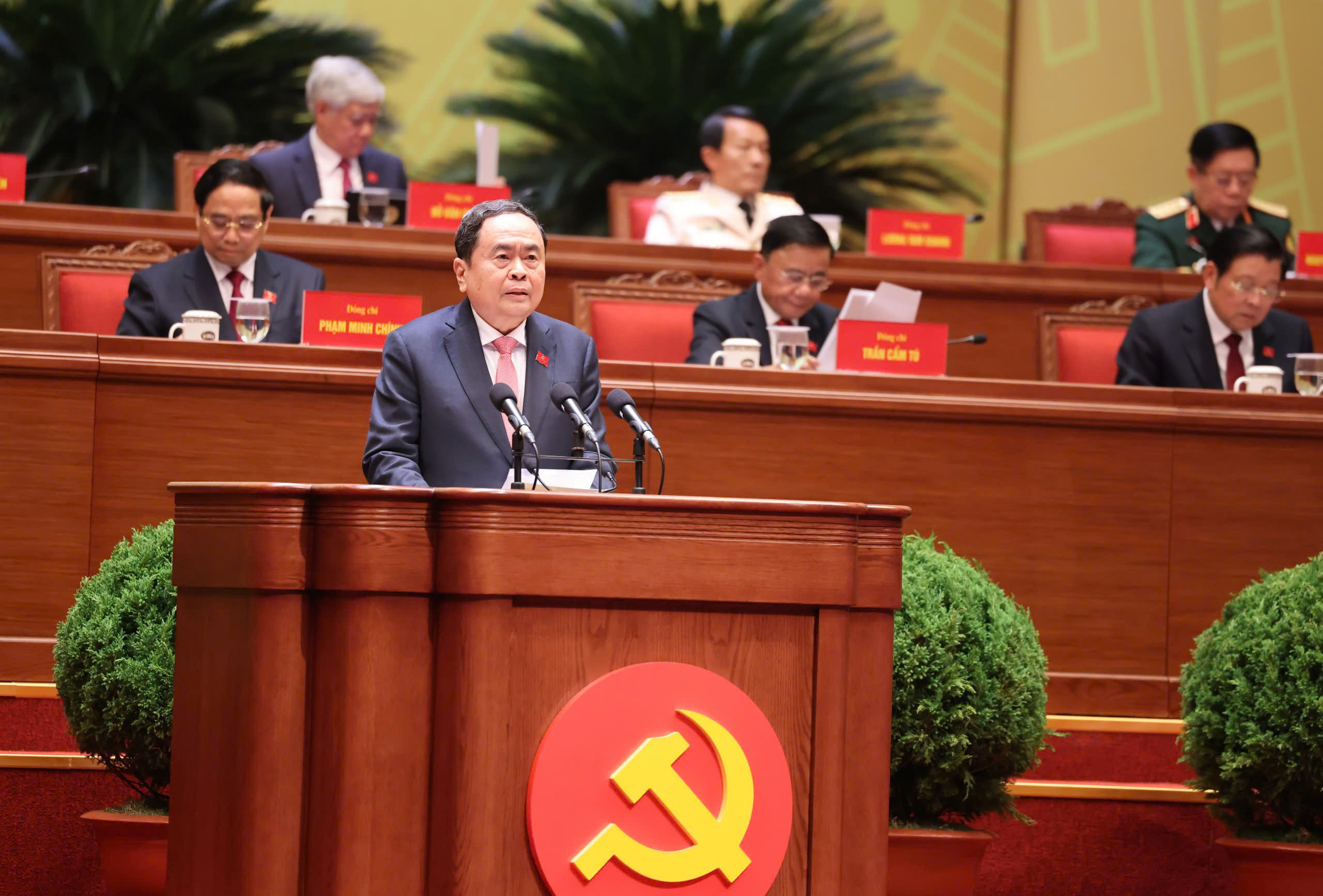 Chủ tịch Quốc hội Trần Thanh Mẫn trình bày báo cáo kết quả Hội nghị lần thứ nhất Ban Chấp hành Trung ương Đảng khóa XIV tại phiên bế mạc. Ảnh: QUANG PHÚC