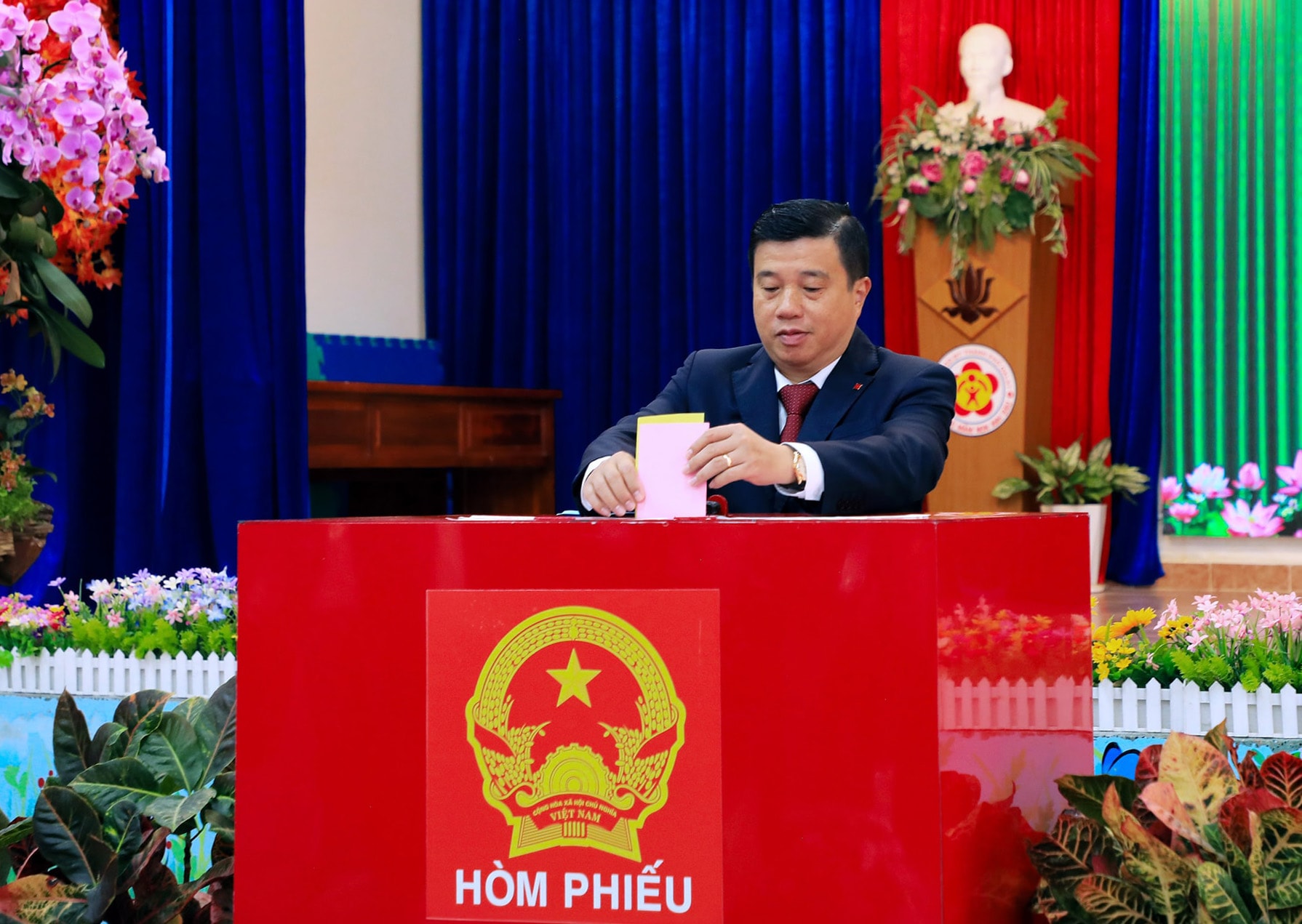 Đồng chí Lưu Văn Trung, Phó Bí thư Tỉnh ủy, Chủ tịch HĐND tỉnh, Chủ tịch Ủy ban Bầu cử tỉnh Lâm Đồng bỏ phiếu bầu tại điểm bỏ phiếu số 11, TDP 5 Nghĩa Phú, phường Nam Gia Nghĩa