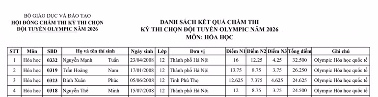 Danh sách các học sinh của đội tuyển Olympic Hóa học quốc tế năm 2026: