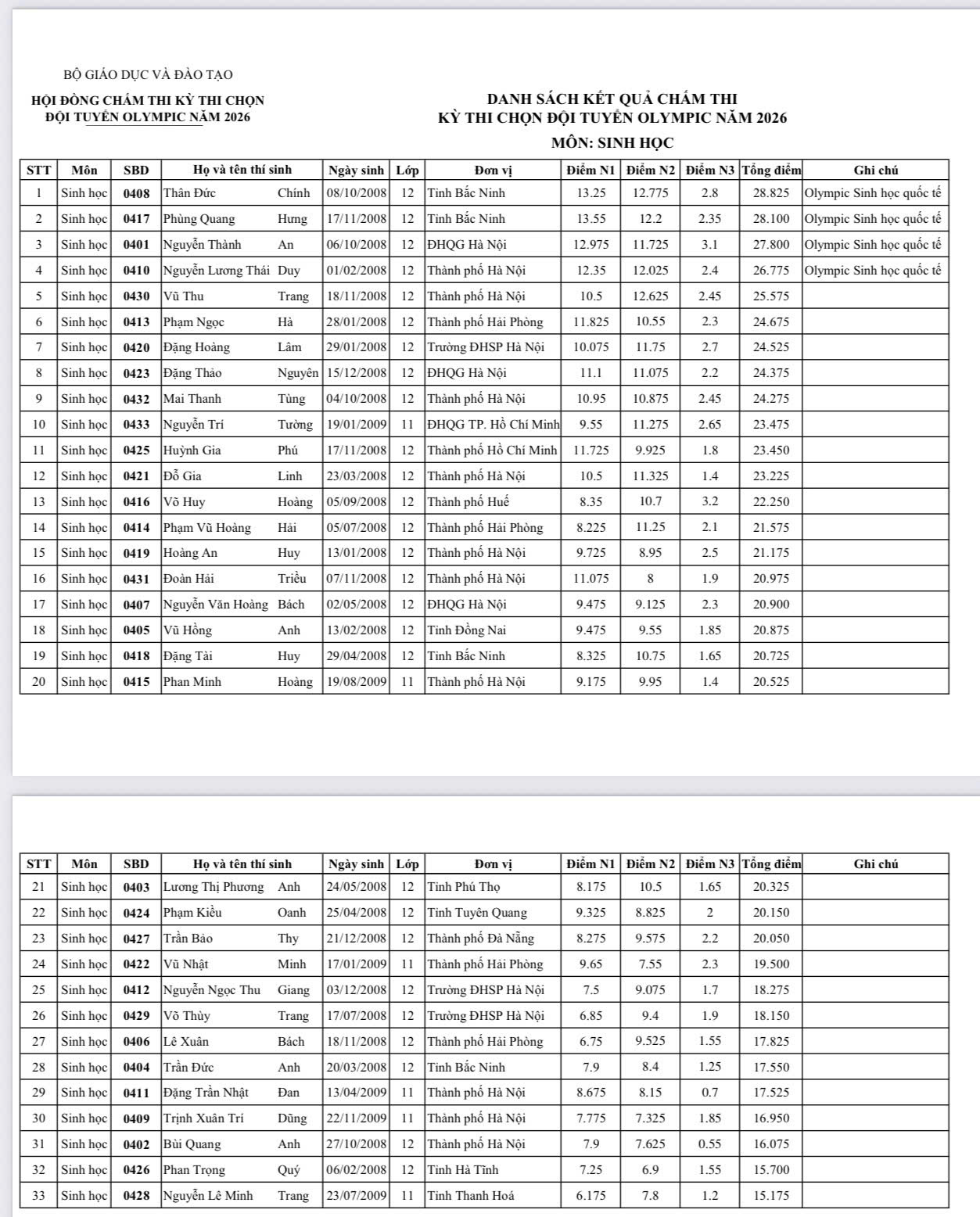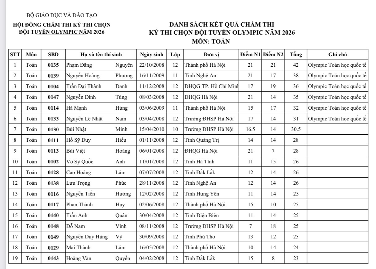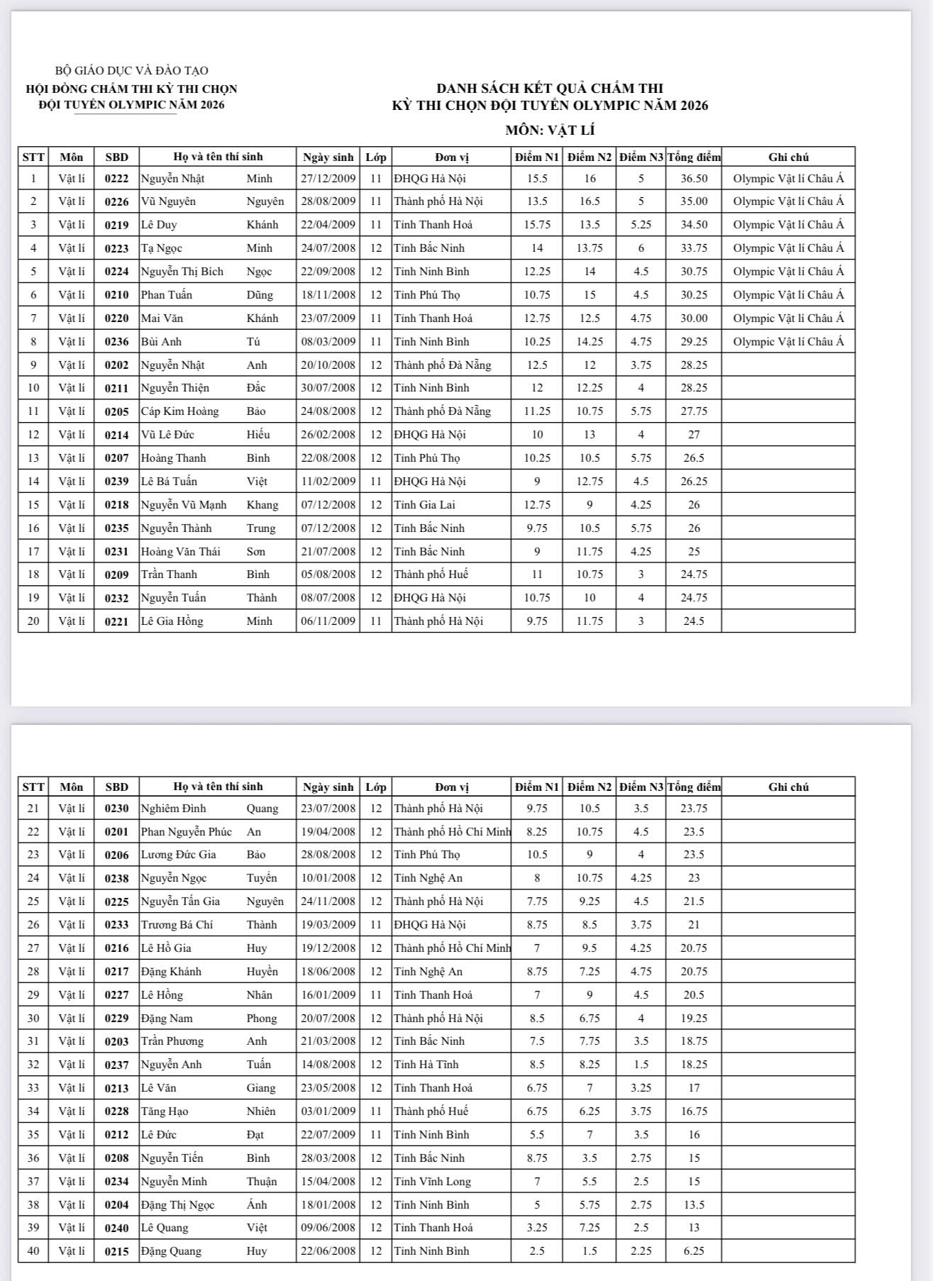 Kết quả chấm thi Kỳ thi chọn đội tuyển Olympic khu vực và quốc tế năm 2026 ở các môn Toán, Vật lý, Hóa học, Sinh học và Tin học như sau: