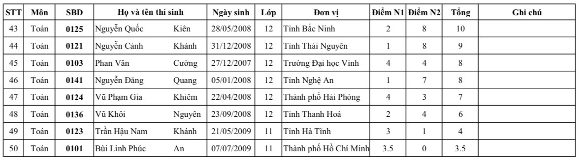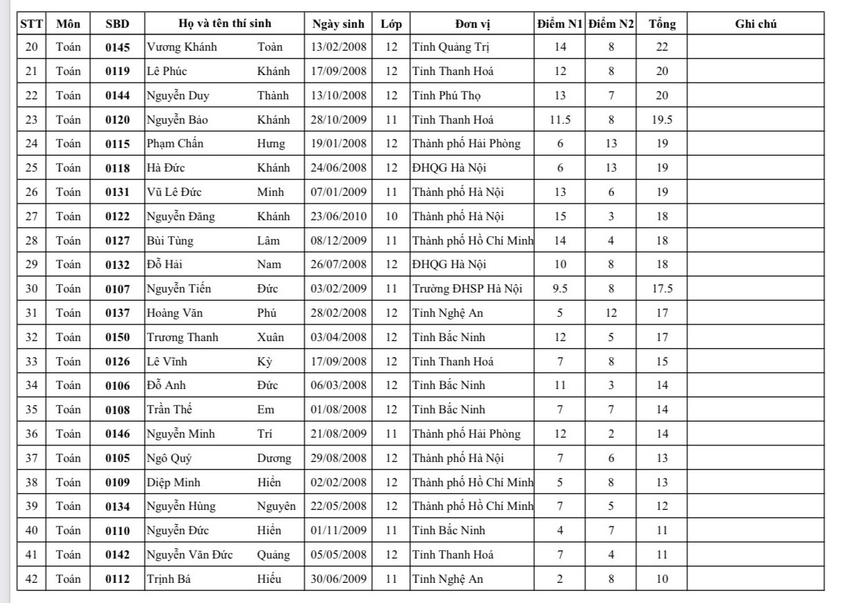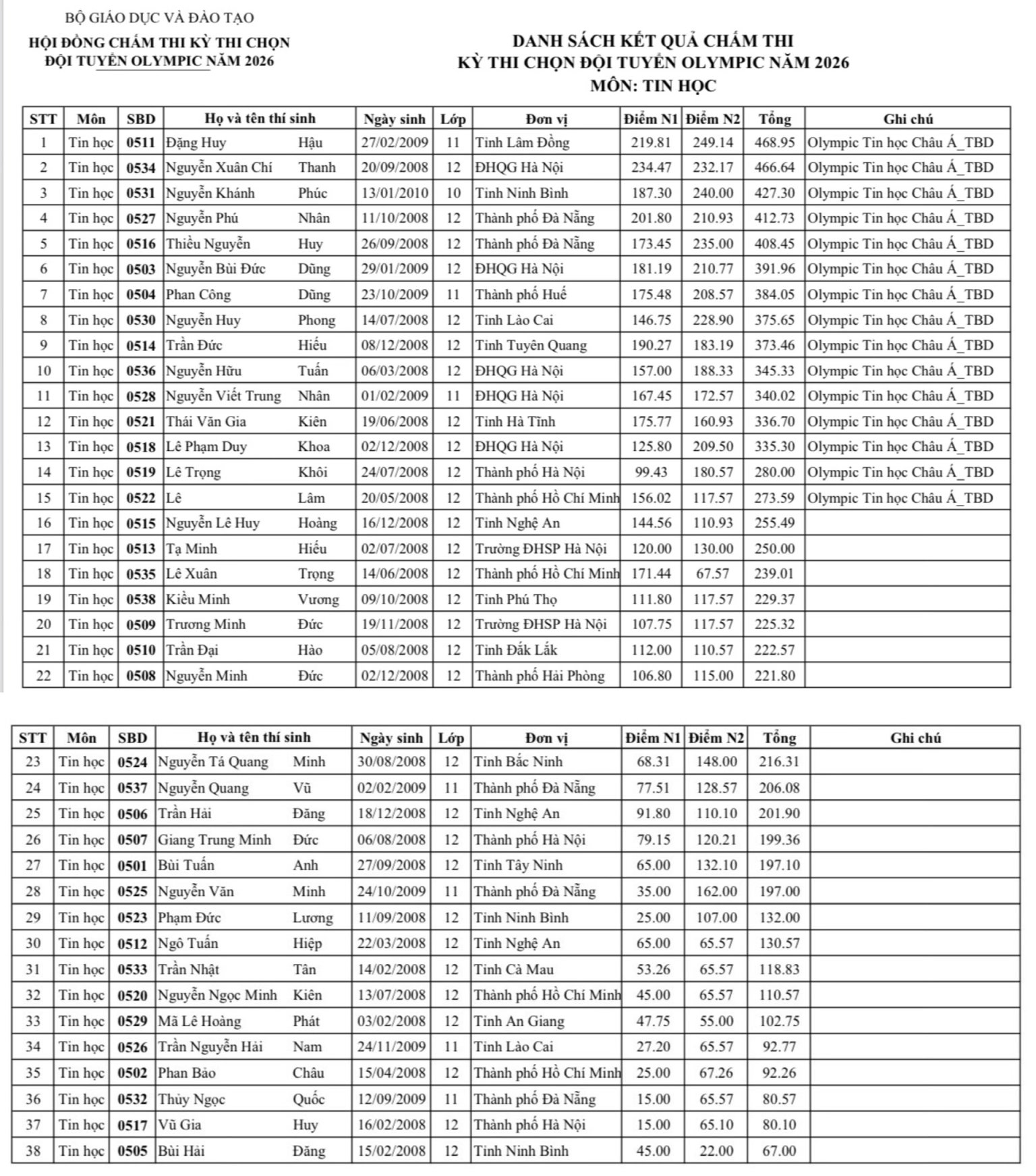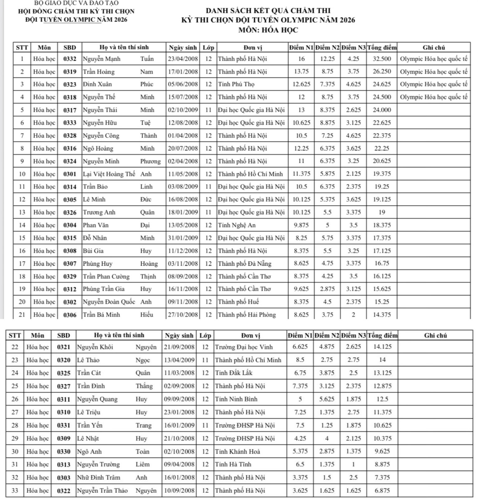 Kết quả chấm thi Kỳ thi chọn đội tuyển Olympic khu vực và quốc tế năm 2026 ở các môn Toán, Vật lý, Hóa học, Sinh học và Tin học như sau: