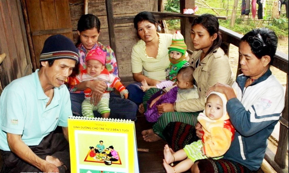 Y tế thôn bản kiểm tra tư vấn dinh dưỡng trẻ em cho đồng bào dân tộc Bru-Vân Kiều.