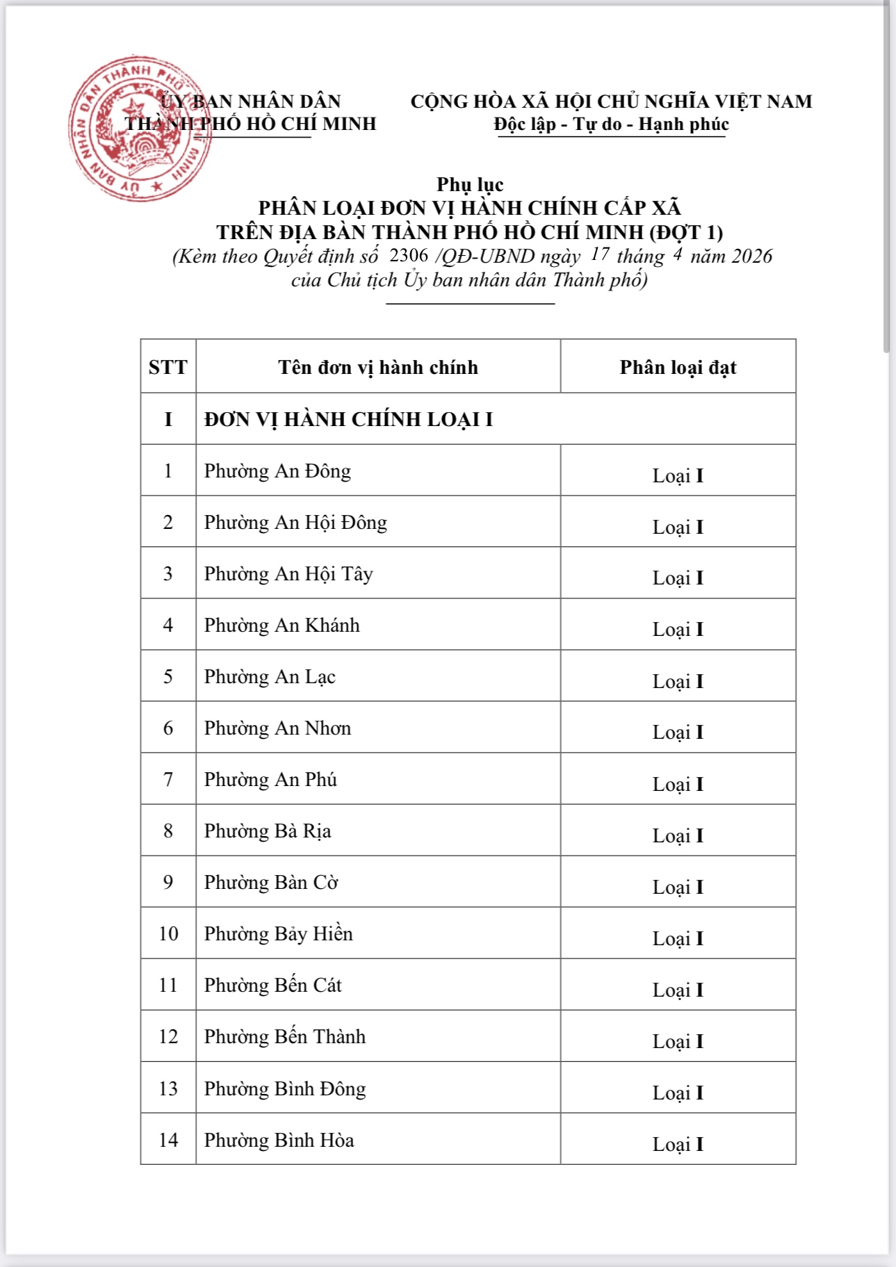 UBND TP.HCM vừa công bố quyết định phân loại đơn vị hành chính cấp xã trên địa bàn TP (đợt 1).