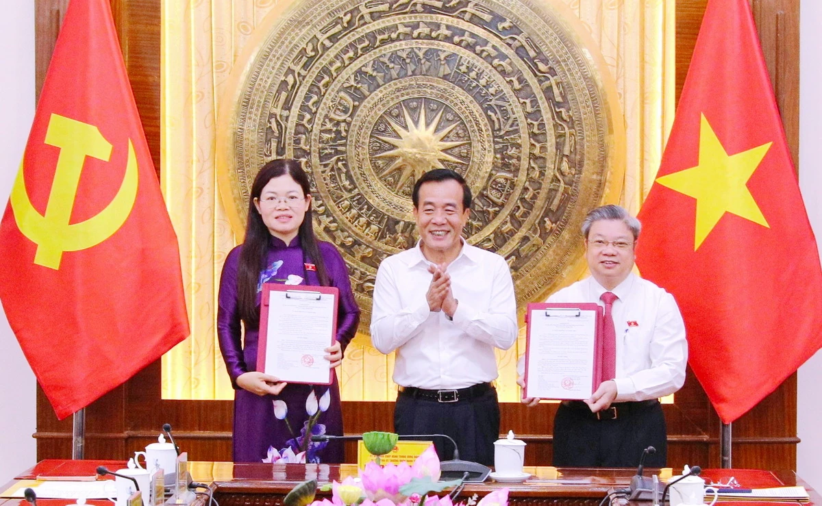 Bí thư Tỉnh ủy, Trưởng Đoàn ĐBQH tỉnh Lê Đức Thái trao Nghị quyết của Ủy ban Thường vụ Quốc hội cho đồng chí Lương Thị Hoa và đồng chí Bùi Văn Dũng.