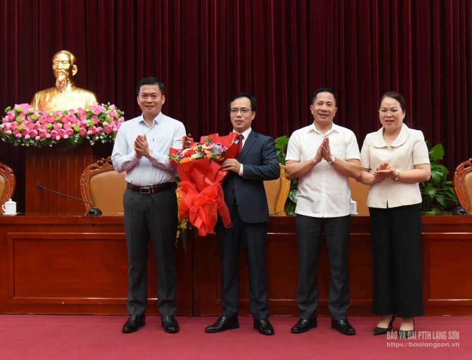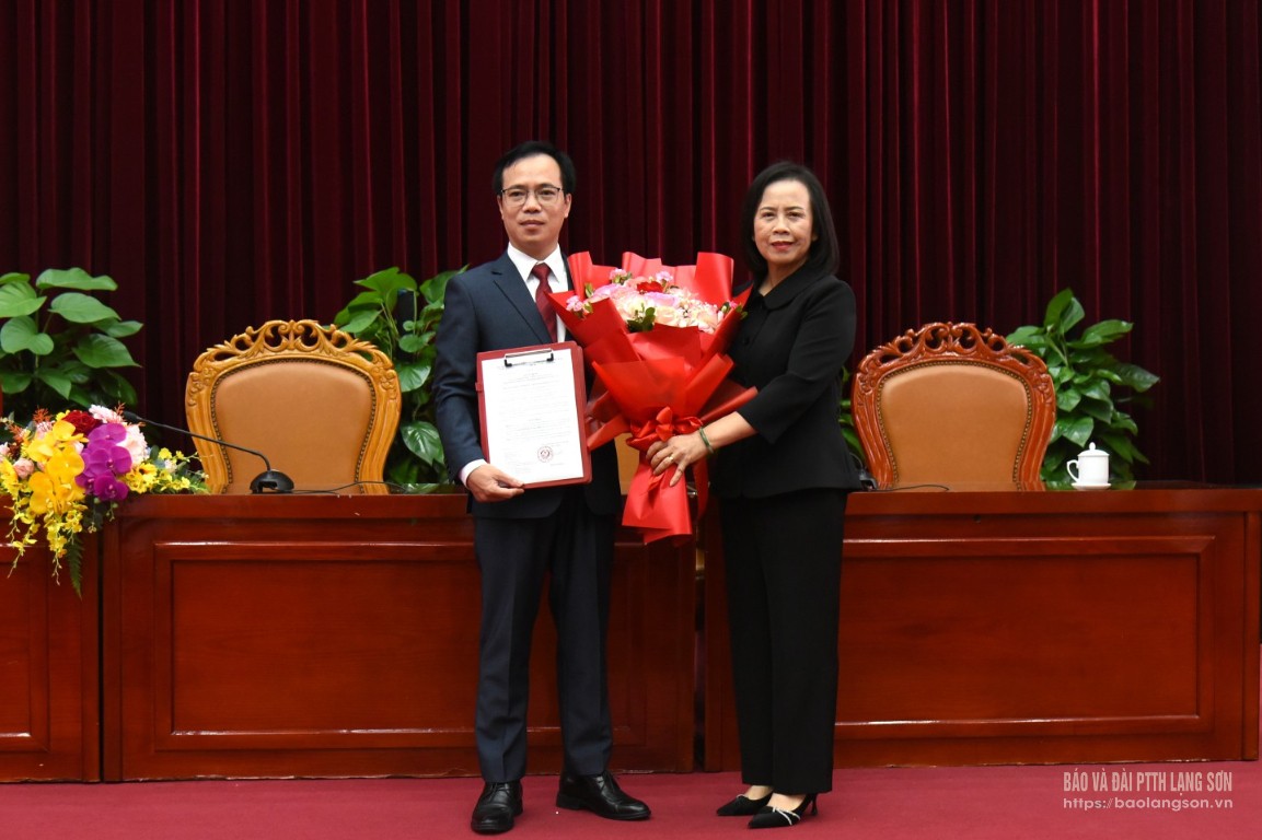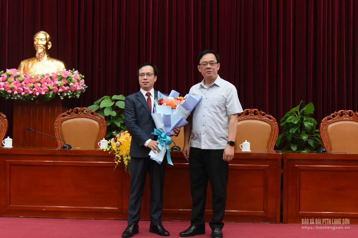Đồng chí Đoàn Thị Hậu, Phó Bí thư Thường trực Tỉnh ủy, Chủ tịch HĐND tỉnh trao quyết định, tặng hoa chúc mừng cho đồng chí Vũ Quang Hưng