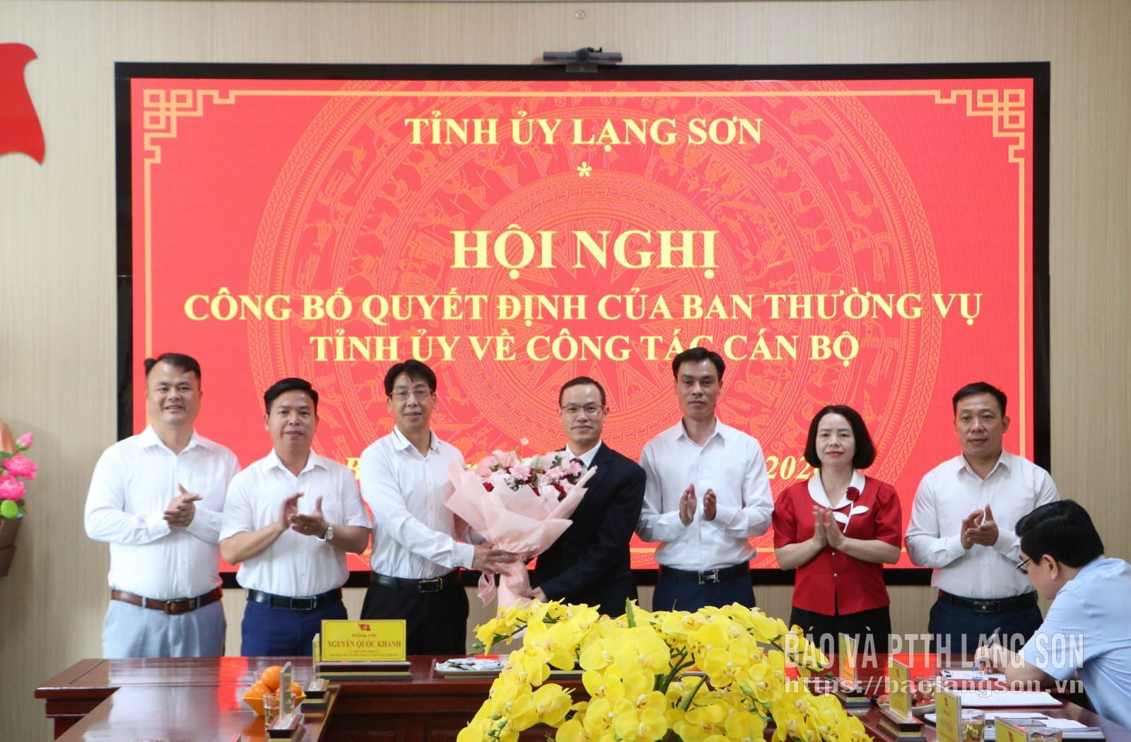 Đồng chí Nguyễn Quốc Khánh, Ủy viên Ban Thường vụ Tỉnh ủy, Trưởng Ban Tuyên giáo và Dân vận Tỉnh ủy trao quyết định và tặng hoa chúc mừng đồng chí Nông Hồng Giang