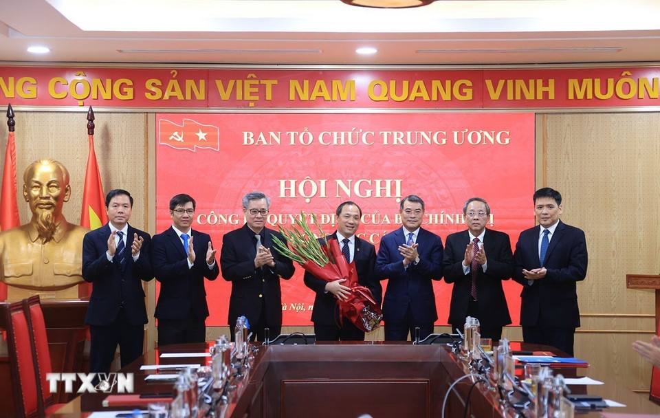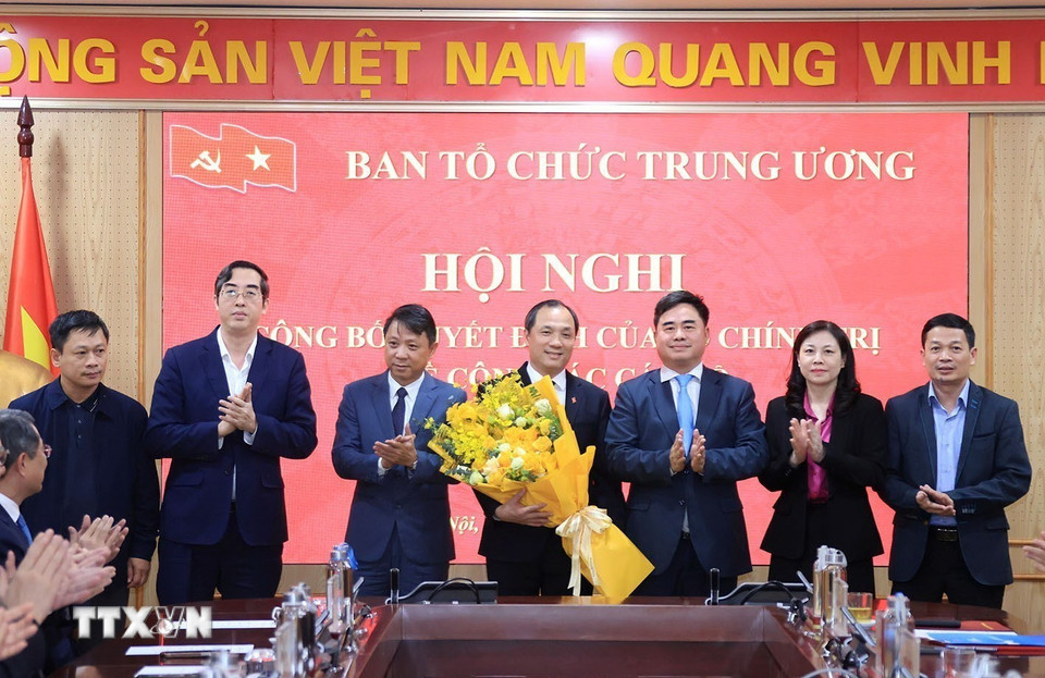Các đồng chí Ban Tổ chức Trung ương tặng hoa chúc mừng ông Hoàng Trung Dũng. (Ảnh: Tuấn Anh/TTXVN)