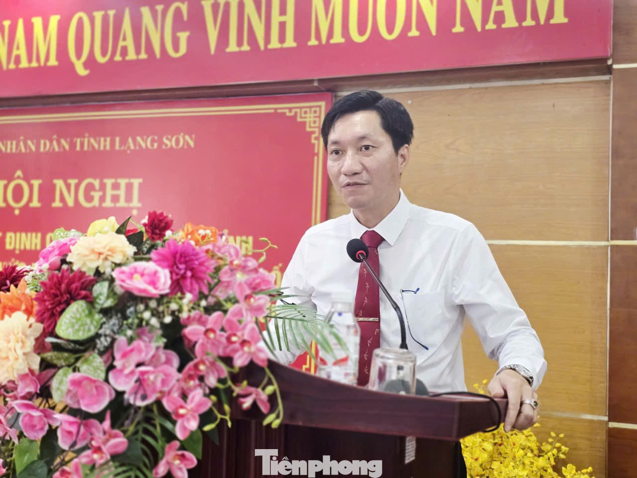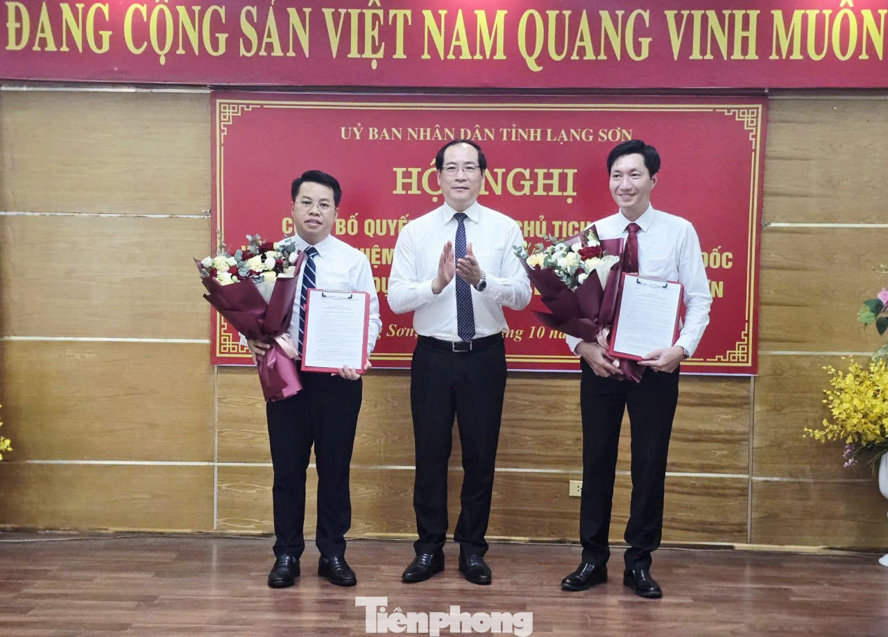Lãnh đạo tỉnh Lạng Sơn trao quyết định, tặng hoa cho tân Giám đốc Bùi Hoàng Nam (bên phải), tân Phó Giám đốc Nguyễn Mạnh Đức (bên trái). Ảnh: Duy Chiến.