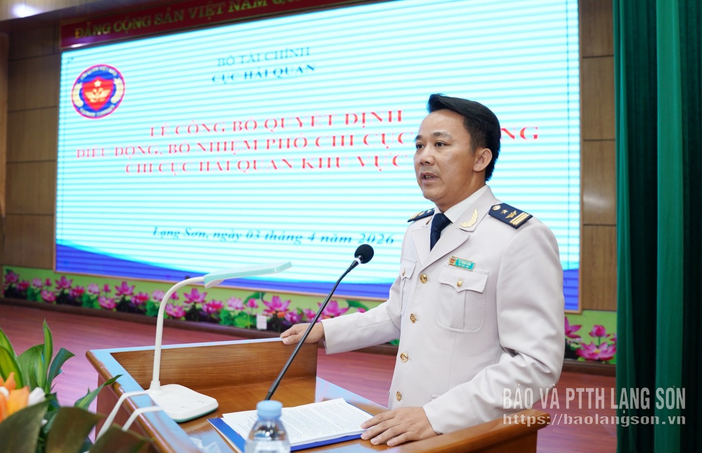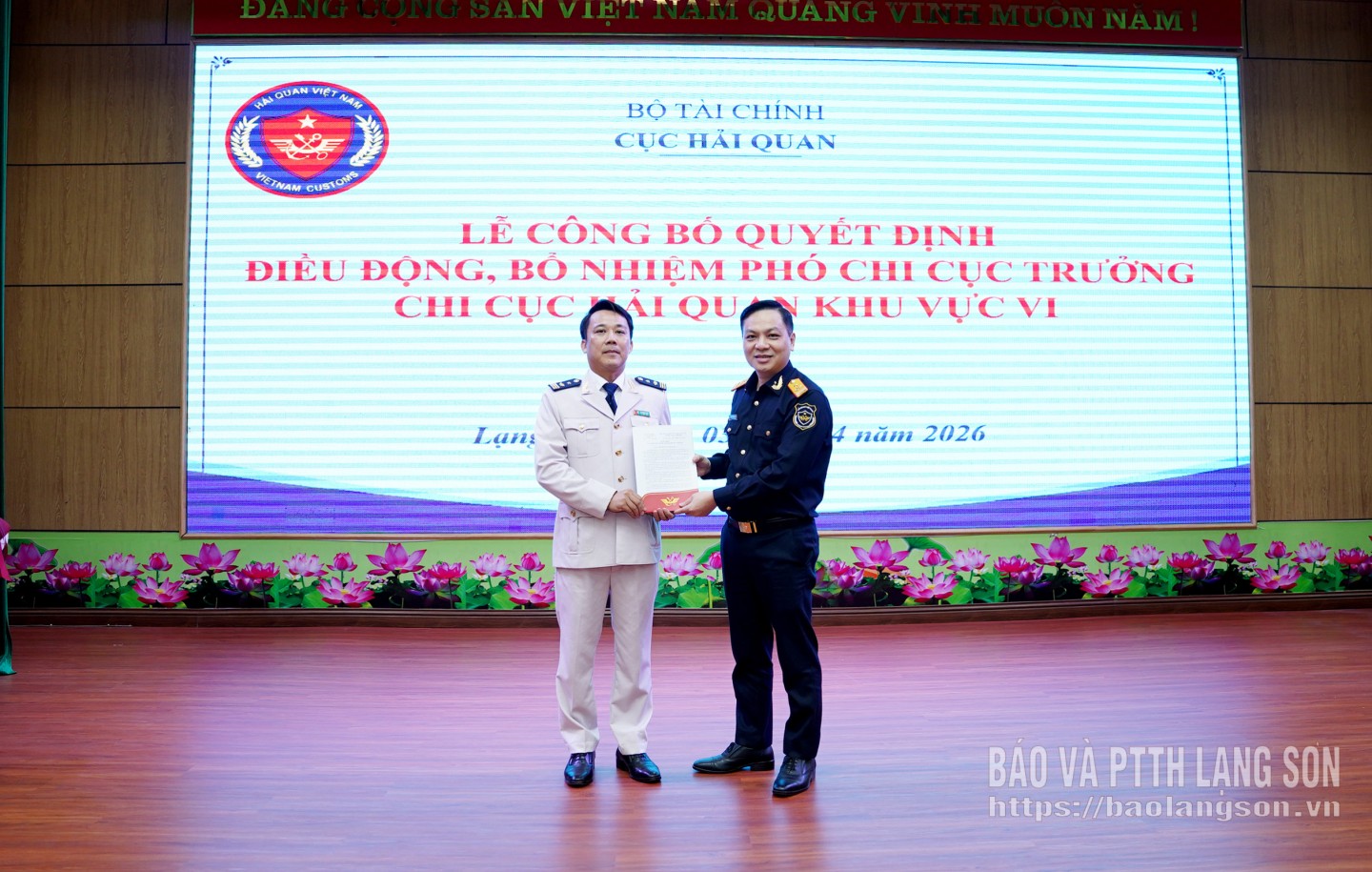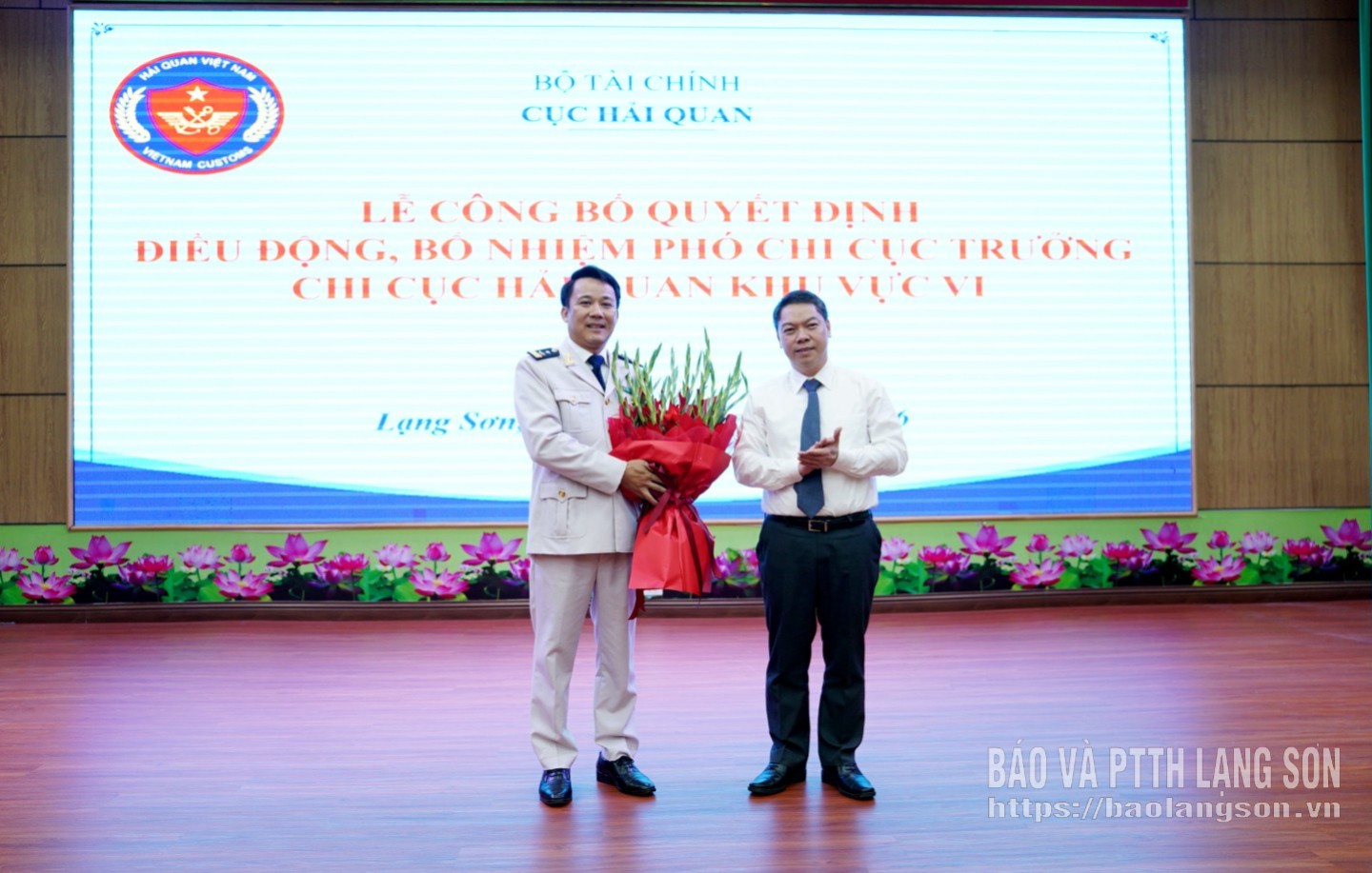 Thay mặt lãnh đạo tỉnh Lạng Sơn, đồng chí Đoàn Thanh Sơn, Phó Chủ tịch UBND tỉnh tặng hoa, chúc mừng đồng chí tân Phó Chi cục trưởng Chi cục Hải quan khu vực VI