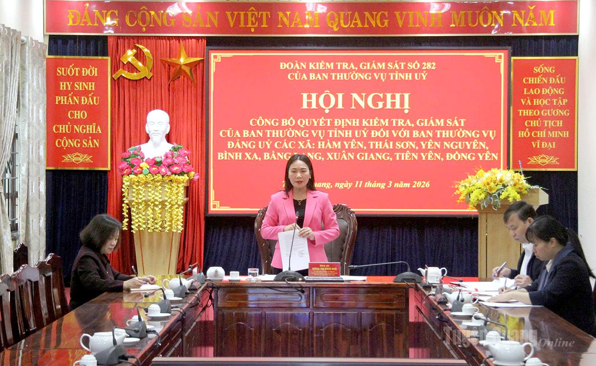 Đồng chí Nông Thị Bích Huệ, Ủy viên Ban Thường vụ Tỉnh ủy, Phó Bí thư Thường trực chuyên trách Đảng ủy UBND tỉnh, Trưởng đoàn kiểm tra, giám sát số 282 của Ban Thường vụ Tỉnh ủy chủ trì hội nghị công bố Quyết định kiểm tra, giám sát.