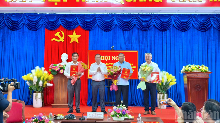 Phó Chủ tịch Ủy ban nhân dân tỉnh Cà Mau Huỳnh Chí Nguyện (thứ 2 từ phải qua) trao quyết định và tặng hoa chúc mừng lãnh đạo Ban Quản lý Khu Kinh tế tỉnh Cà Mau.