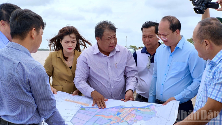 Trưởng Ban Quản lý Khu kinh tế tỉnh Cà Mau Dương Hoài Nam (giữa) báo cáo tại hiện trường với lãnh đạo tỉnh Cà Mau về tình hình kêu gọi đầu tư Khu kinh tế Năm Căn.