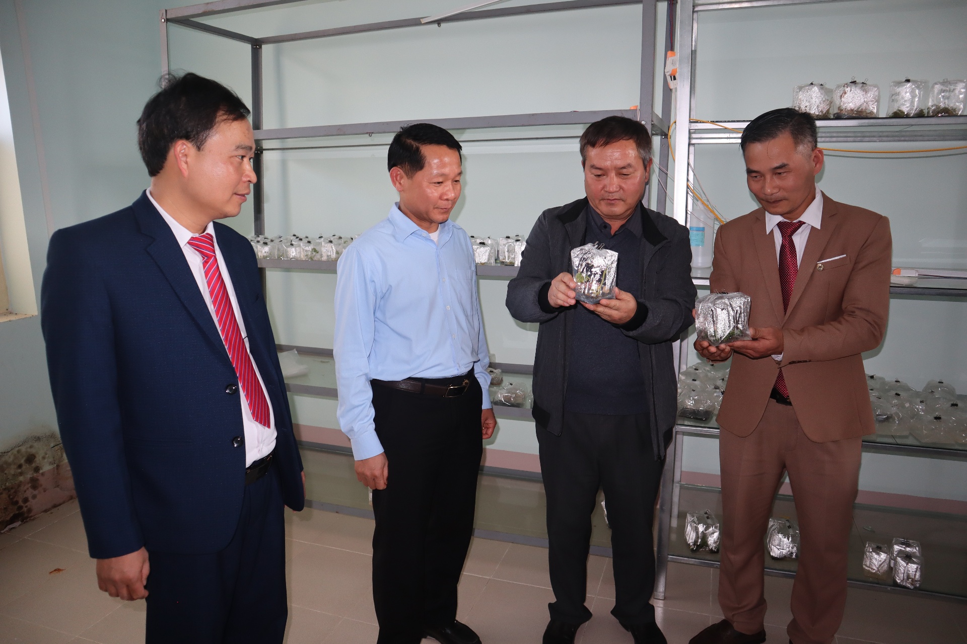 Phó Chủ tịch UBND tỉnh Giàng A Tính cùng các đại biểu tham quan máy móc, thiết bị của Trung tâm ĐMST&CĐS.