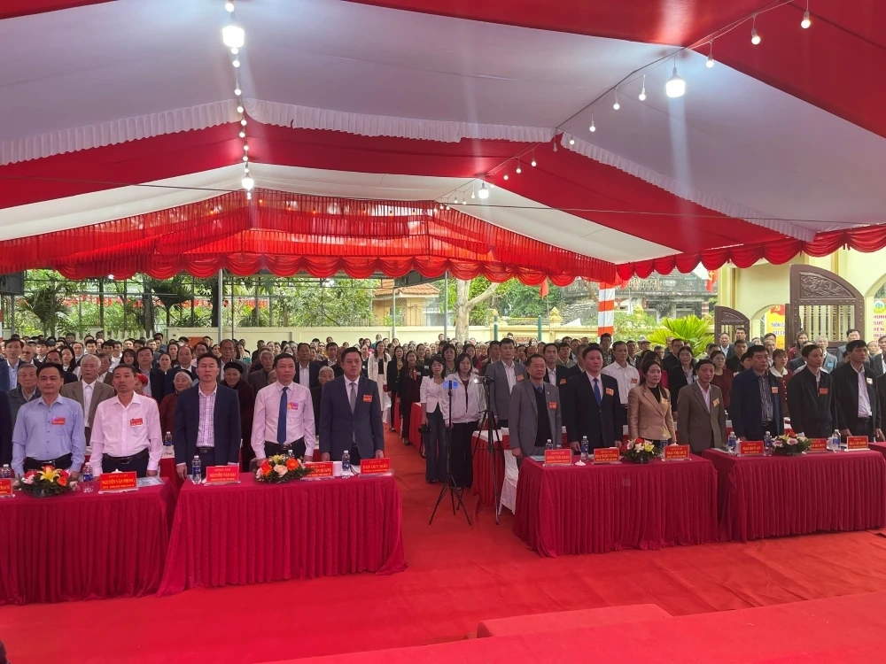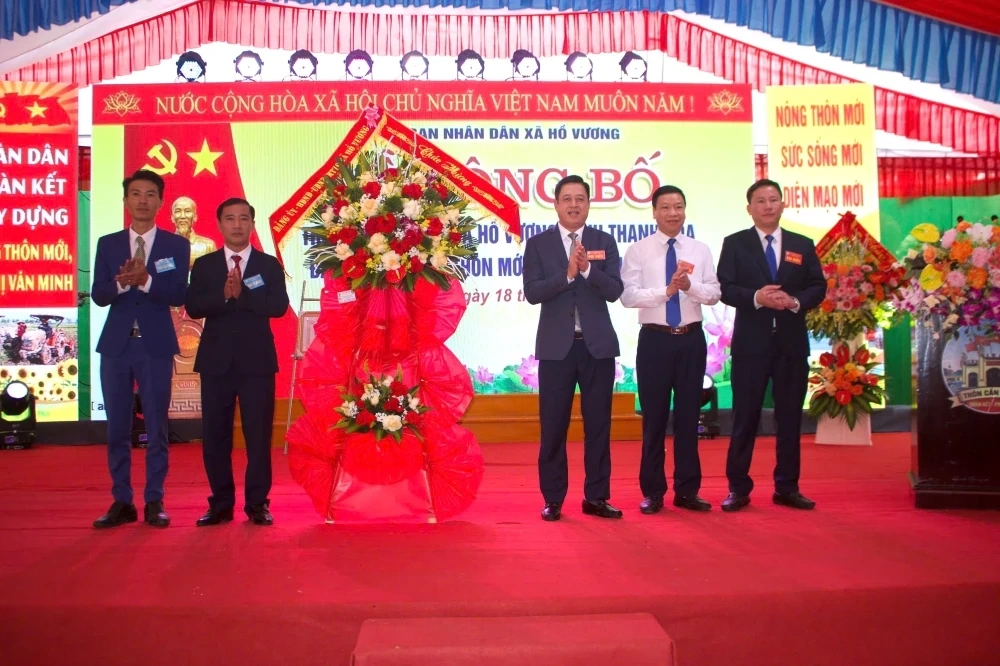 Lãnh đạo xã Hồ Vương tặng hoa chúc mừng thôn Cần Thanh.