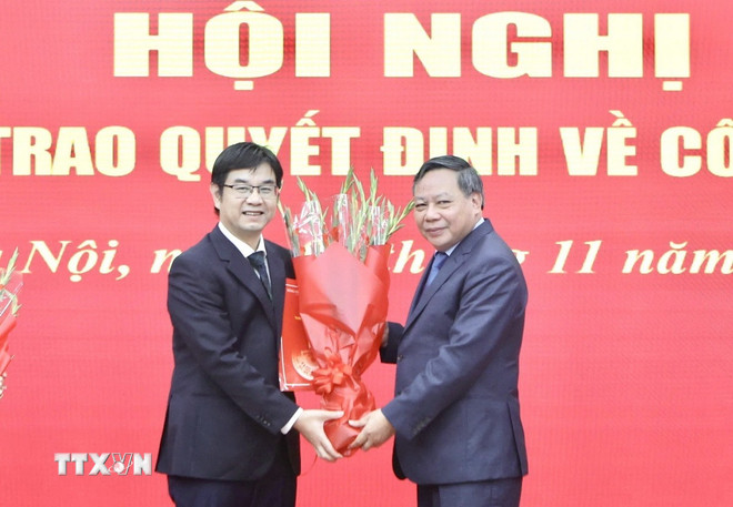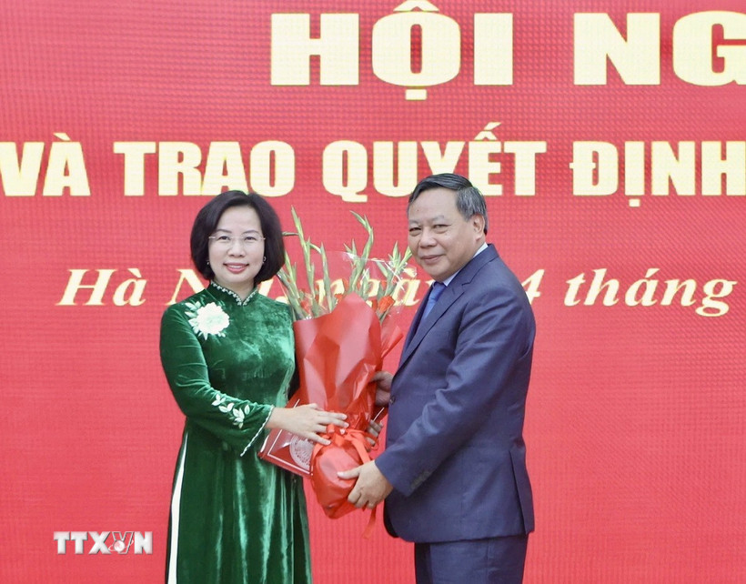 Phó Bí thư Thường trực Thành ủy Hà Nội Nguyễn Văn Phong tặng hoa, chúc mừng bà Bùi Huyền Mai được chỉ định giữ chức vụ Bí thư Đảng ủy MTTQ Việt Nam thành phố Hà Nội nhiệm kỳ 2025-2030. (Ảnh: Minh Nghĩa/TTXVN)