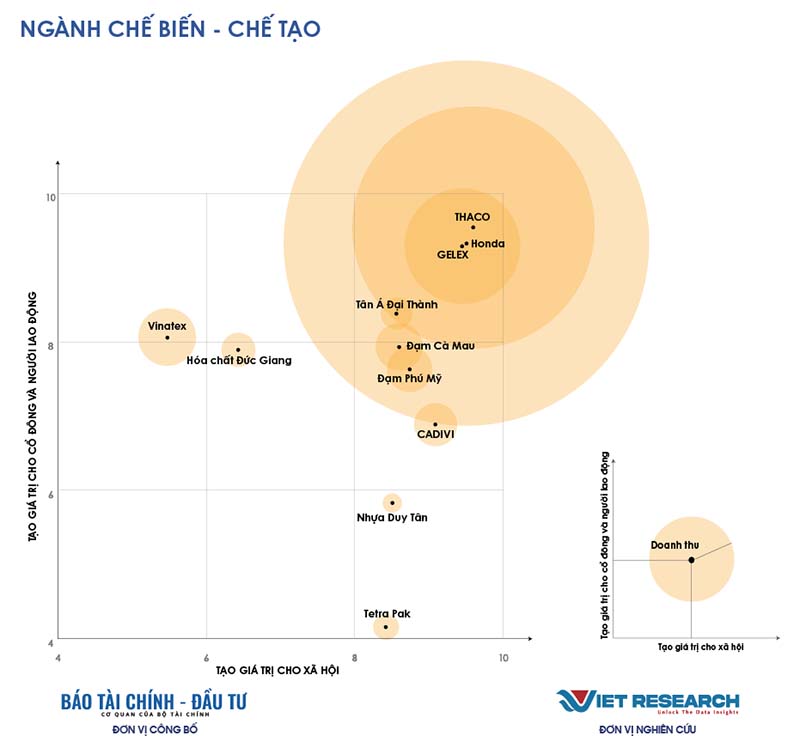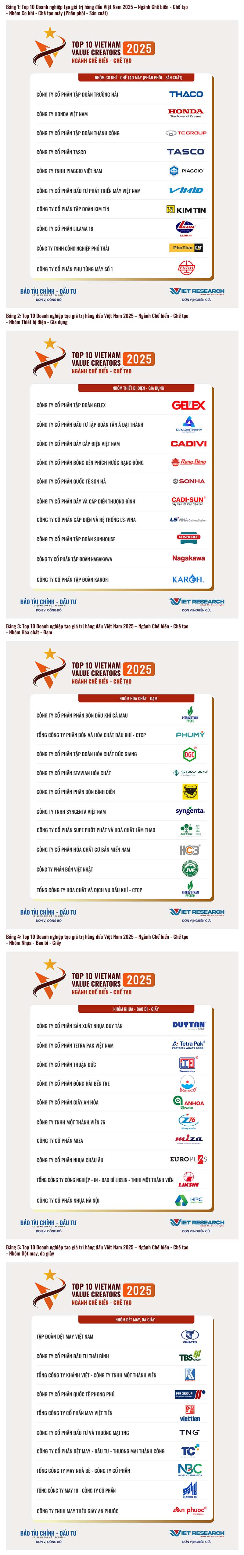 Trong khuôn khổ Chương trình Nghiên cứu toàn quốc về các Doanh nghiệp tạo giá trị hàng đầu Việt Nam, Viet Research phối hợp với Báo Tài chính - Đầu tư (Bộ Tài chính) công bố Top 10 Doanh nghiệp tạo giá trị hàng đầu Việt Nam 2025 ngành Chế biến - Chế tạo. Đây là những doanh nghiệp tiên phong trong việc tạo dựng giá trị cho nền kinh tế và xã hội, thể hiện qua: quy mô và tốc độ tăng trưởng; lợi nhuận và đóng góp cho ngân sách; môi trường, chính sách và phúc lợi lao động; cam kết về ESG và đổi mới sáng tạo.