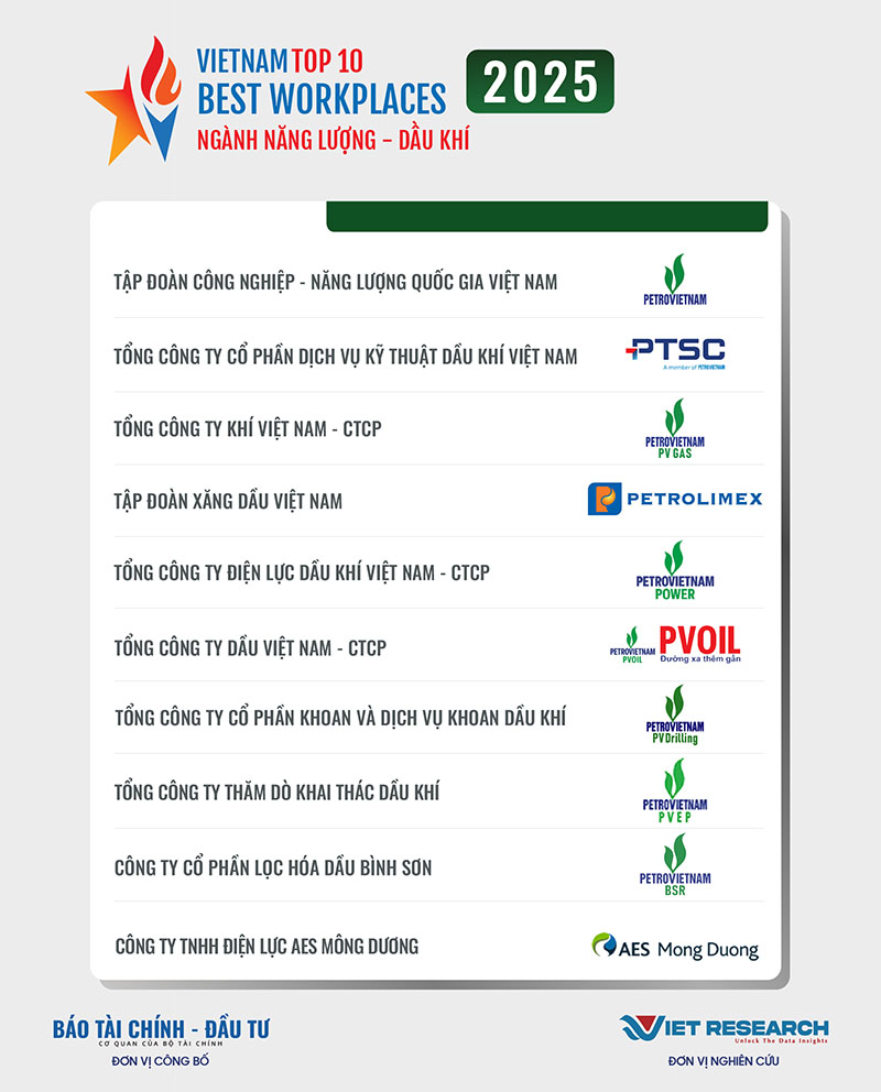 Nguồn: Top 10 Nơi làm việc tốt nhất Việt Nam ngành Năng lượng - Dầu khí (https://vbw10.vn/)