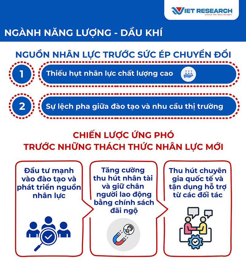 Song song đó là sự lệch pha giữa đào tạo và nhu cầu thị trường. Sự chuyển dịch của ngành diễn ra nhanh hơn khả năng chuẩn bị của hệ thống giáo dục - đào tạo. Ngay cả trong dầu khí truyền thống, nhiều năm qua đã ghi nhận tình trạng ngành học kỹ sư dầu khí không thu hút sinh viên, dù nhu cầu tuyển dụng vẫn tồn tại và mức thu nhập hấp dẫn. Điều này làm kéo dài tình trạng thiếu hụt lao động chất lượng.