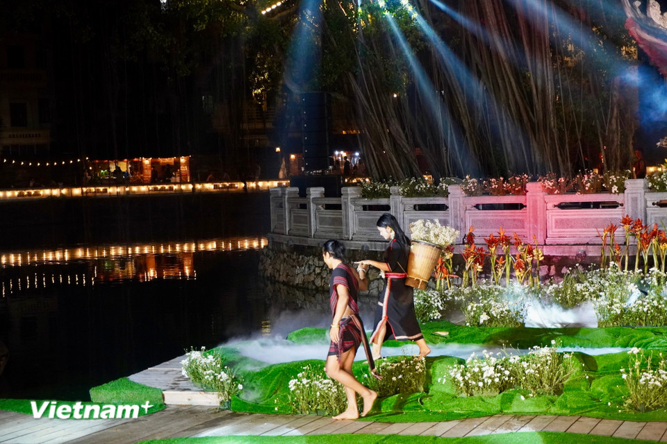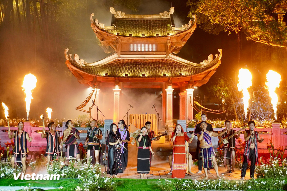 Tối 6/11 tại Hồ Văn (Văn Miếu – Quốc Tử Giám, Hà Nội) đã diễn ra đêm nghệ thuật “Sông Hồng gọi – Đại ngàn reo" nhân kỷ niệm 20 năm Không gian Văn hóa Cồng chiêng Tây Nguyên được UNESCO công nhận là Kiệt tác truyền khẩu và Di sản văn hóa phi vật thể của nhân loại. (Ảnh: Nguyễn Tâm/Vietnam+)