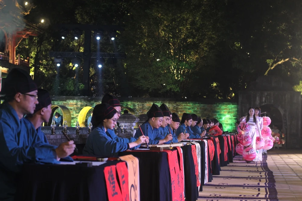 Nghệ thuật trình diễn với hình ảnh ông đồ, học trò của Nhân Mỹ học đường cùng các tiết mục biểu diễn của học sinh, sinh viên và nghệ sĩ. Ảnh: VIẾT THỊNH.