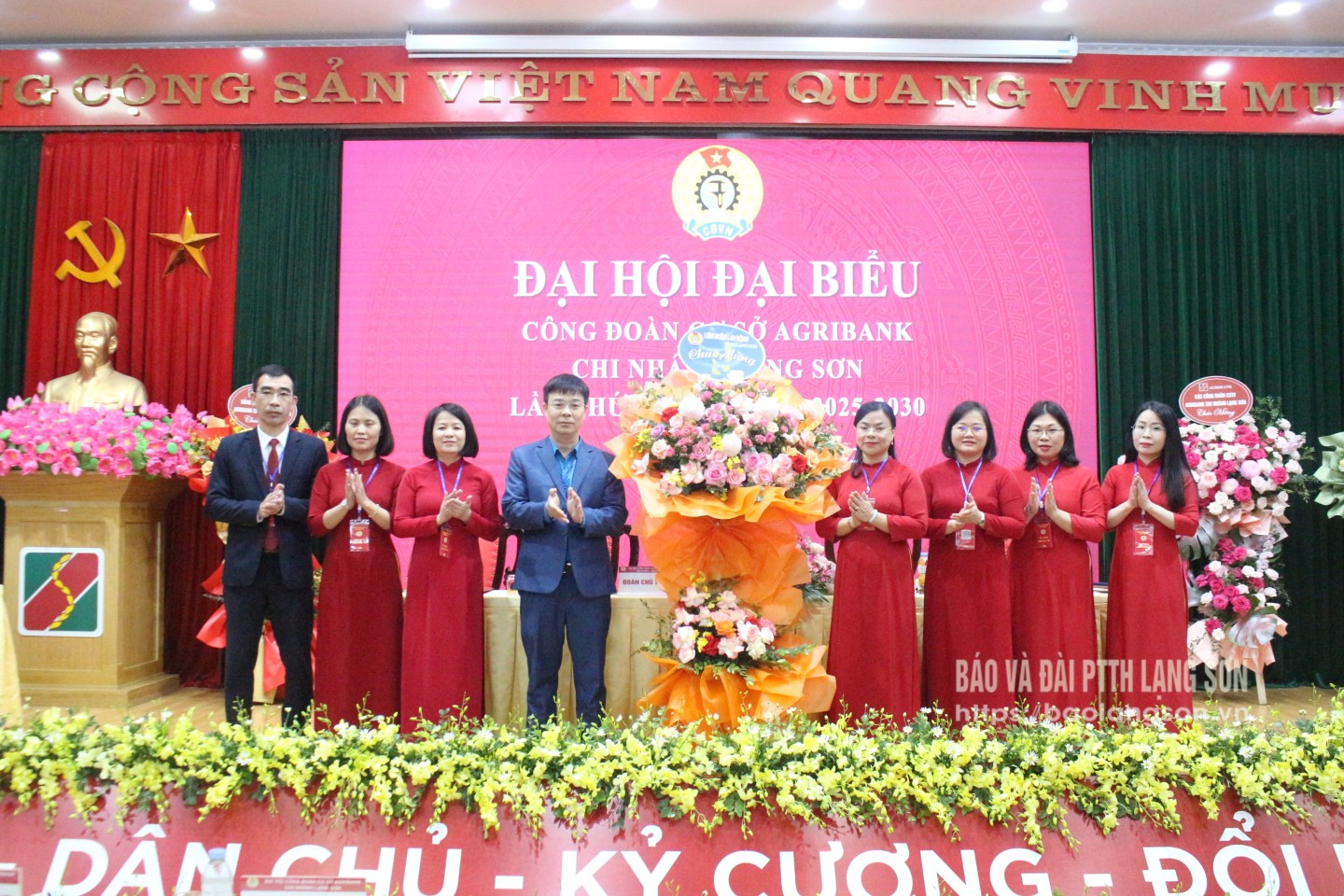 Lãnh đạo Liên đoàn Lao động tỉnh tặng hoa chúc mừng Ban Chấp hành khóa mới CĐCS Agribank Lạng Sơn
