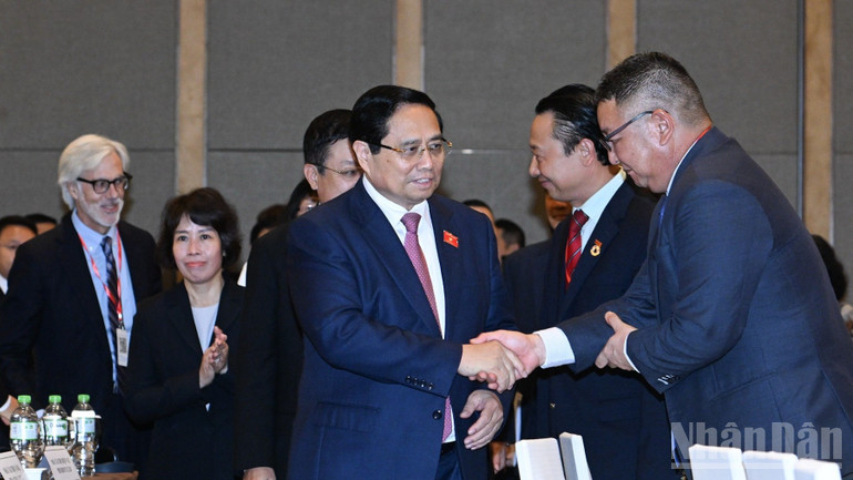 Thủ tướng Phạm Minh Chính với các đại biểu tham dự Diễn đàn Doanh nghiệp Việt Nam thường niên. (Ảnh: TRẦN HẢI)